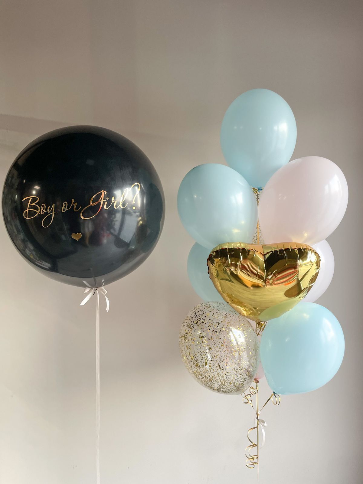 Фонтан 10 Шаров (сердце, 4 голубой макарунс, 4 розовый макарунс, 1 прозрачный с конфетти)