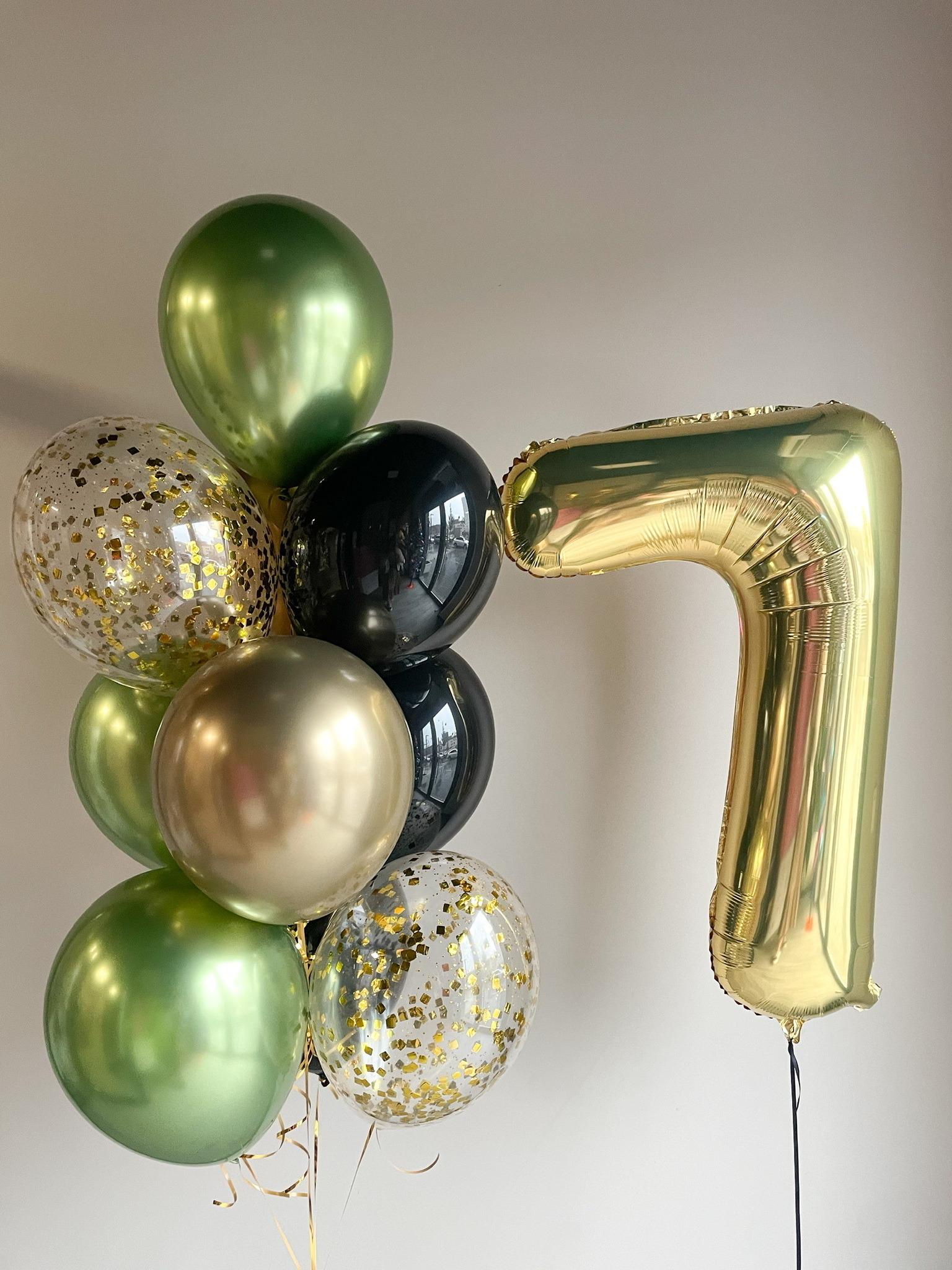 Фонтан из 10 шаров (2 прозрачных с конфетти, 3 черных, 3 хром лайм, 2 хром золото)