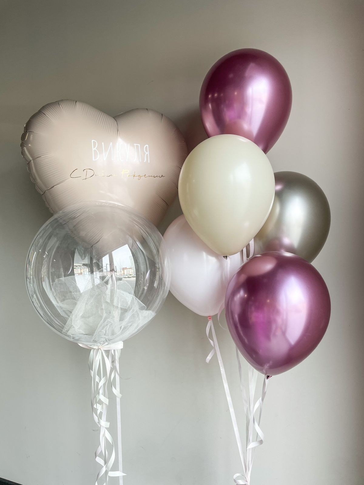 Фонтан из 5 шаров (2 хром фламинго, 1 хром Шампань, 1 белый песок, 1 розовый макарунс)