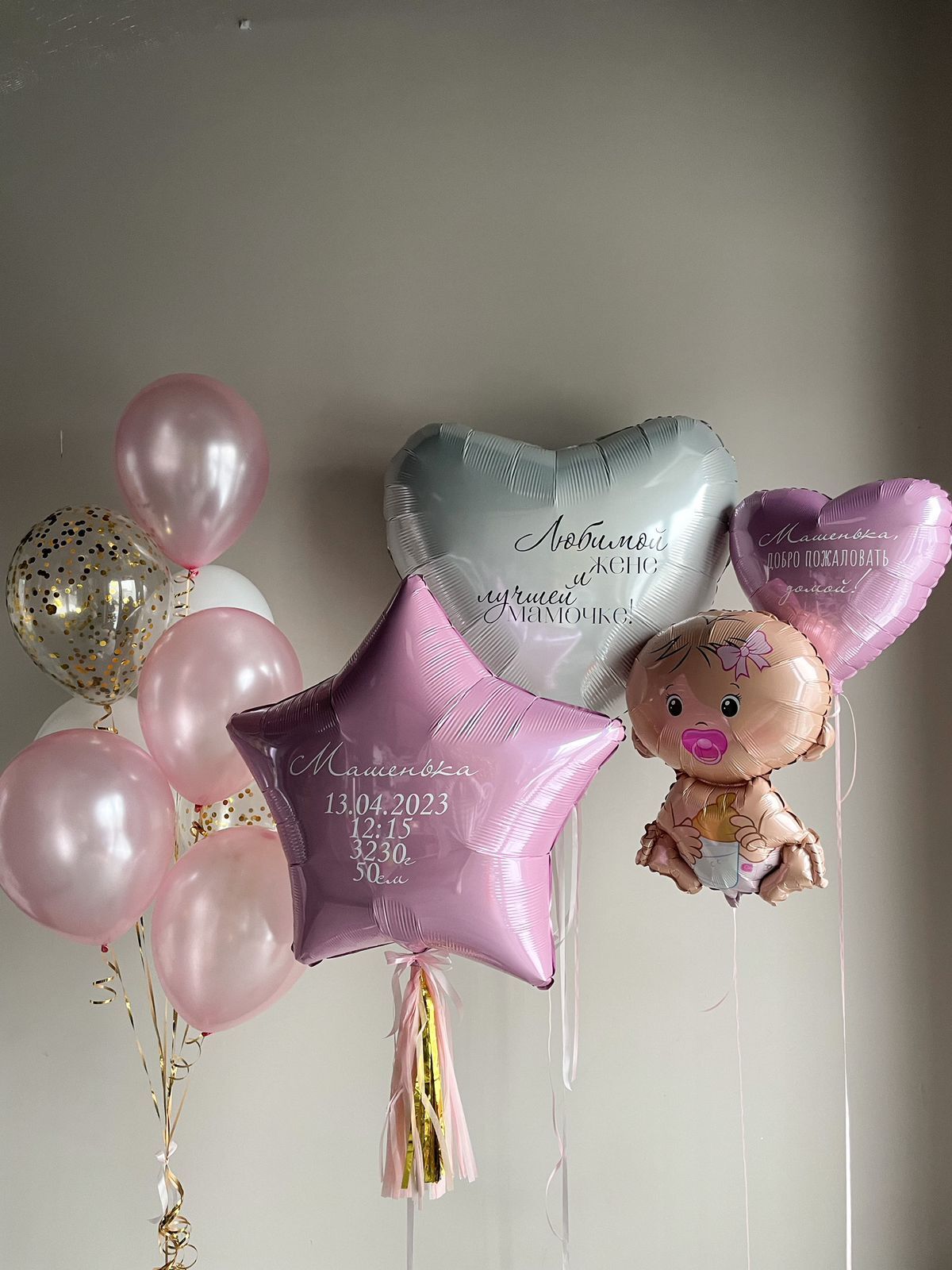 Фонтан из 8 шаров (4 розовый перламутр, 2 белых, 2 прозрачных с конфетти)