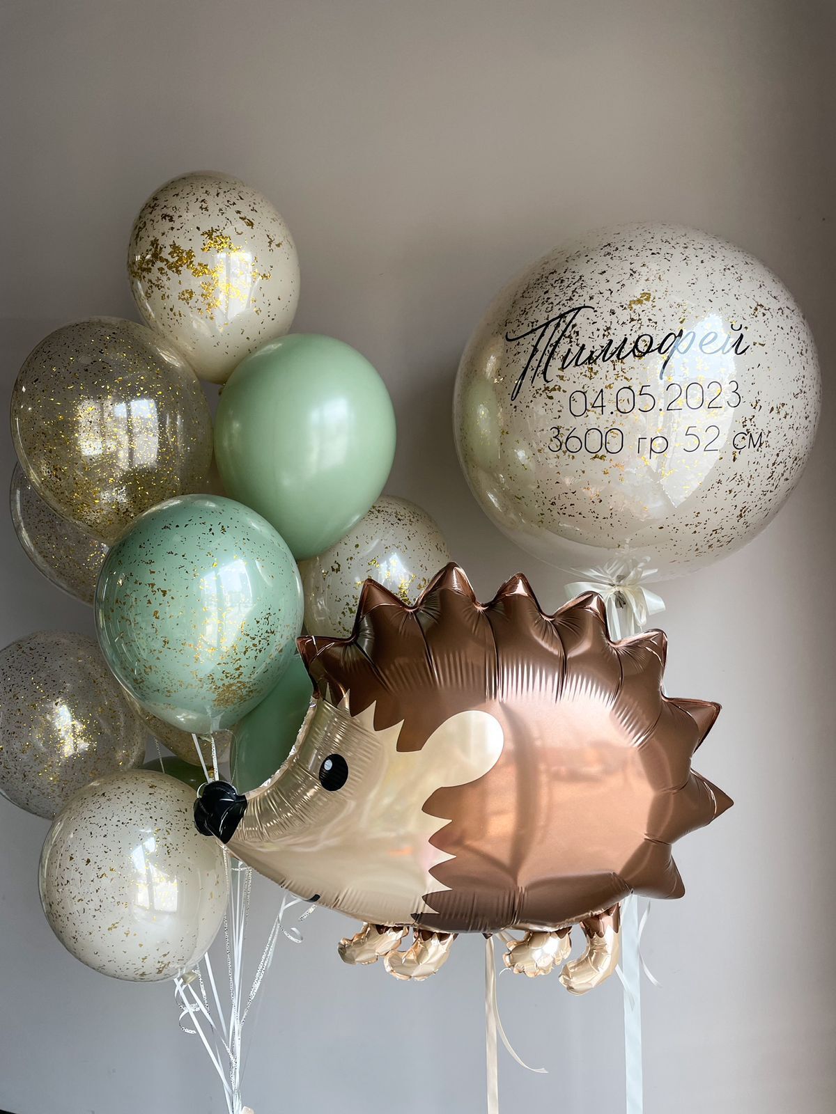 Фонтан из 13 шаров (7 Шаров дабл стафф (5 белый песок и 2 эвкалипт), 3 прозрачных с конфетти, 3 эвкалипт)