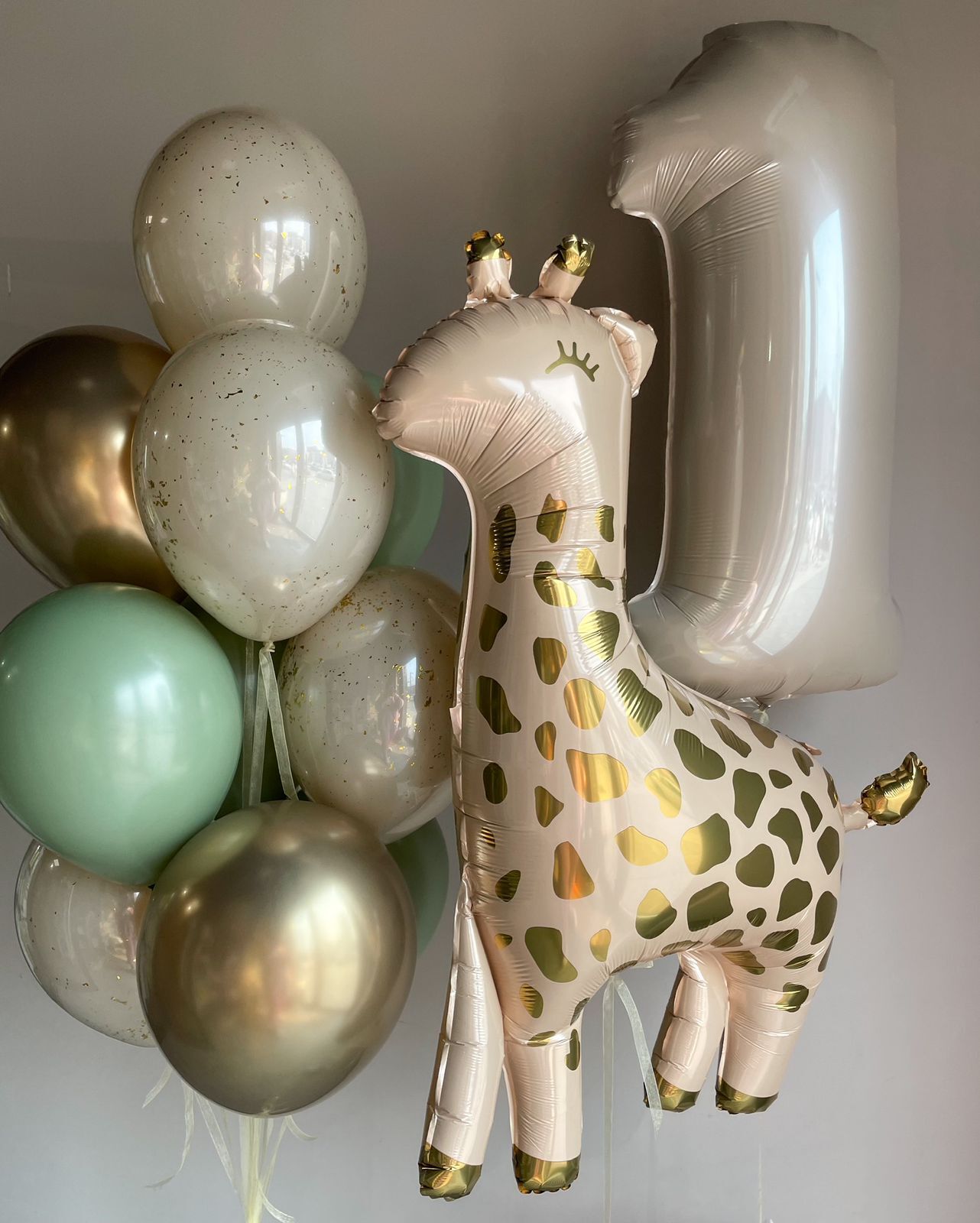Фонтан из 10 шаров (4 белый песок дабл Стафф с конфетти, 3 хром золото, 3 эвкалипт)
