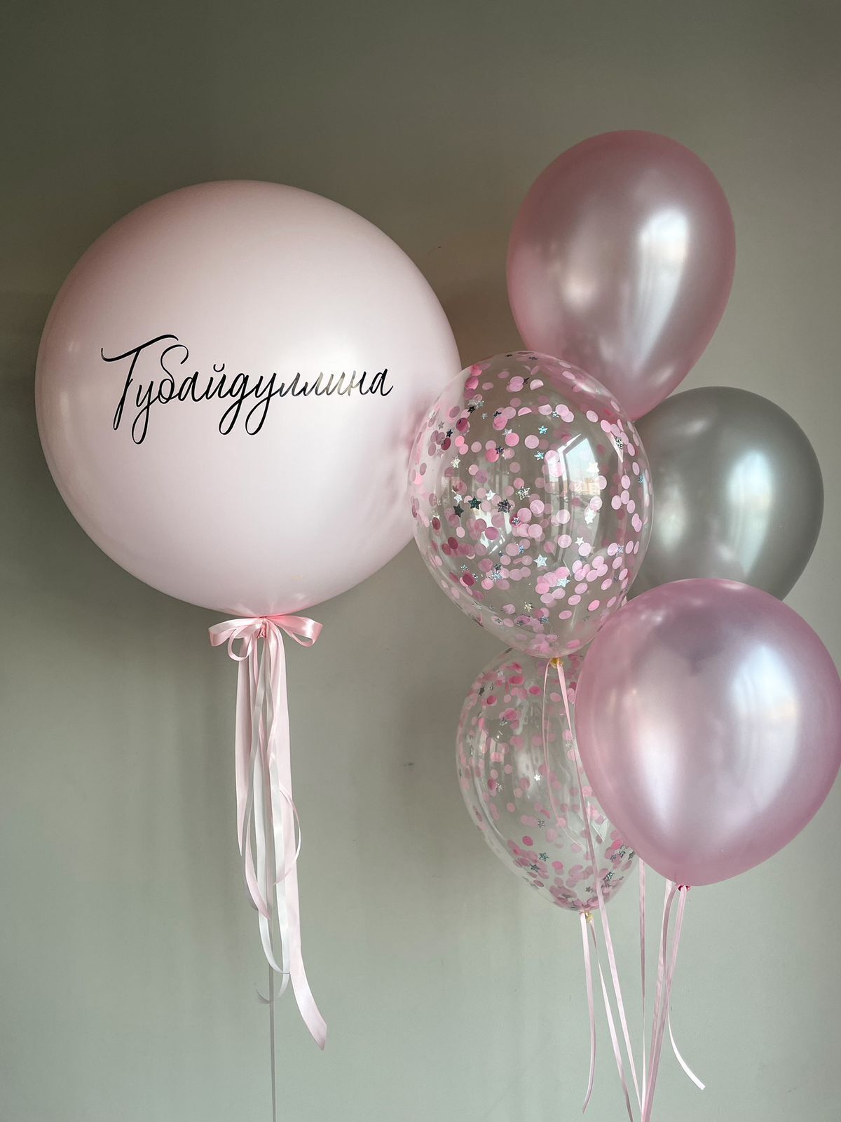 Фонтан из 5 шаров (2 розовый перламутр, 1 серебро перламутр, 2 прозрачных с конфетти)