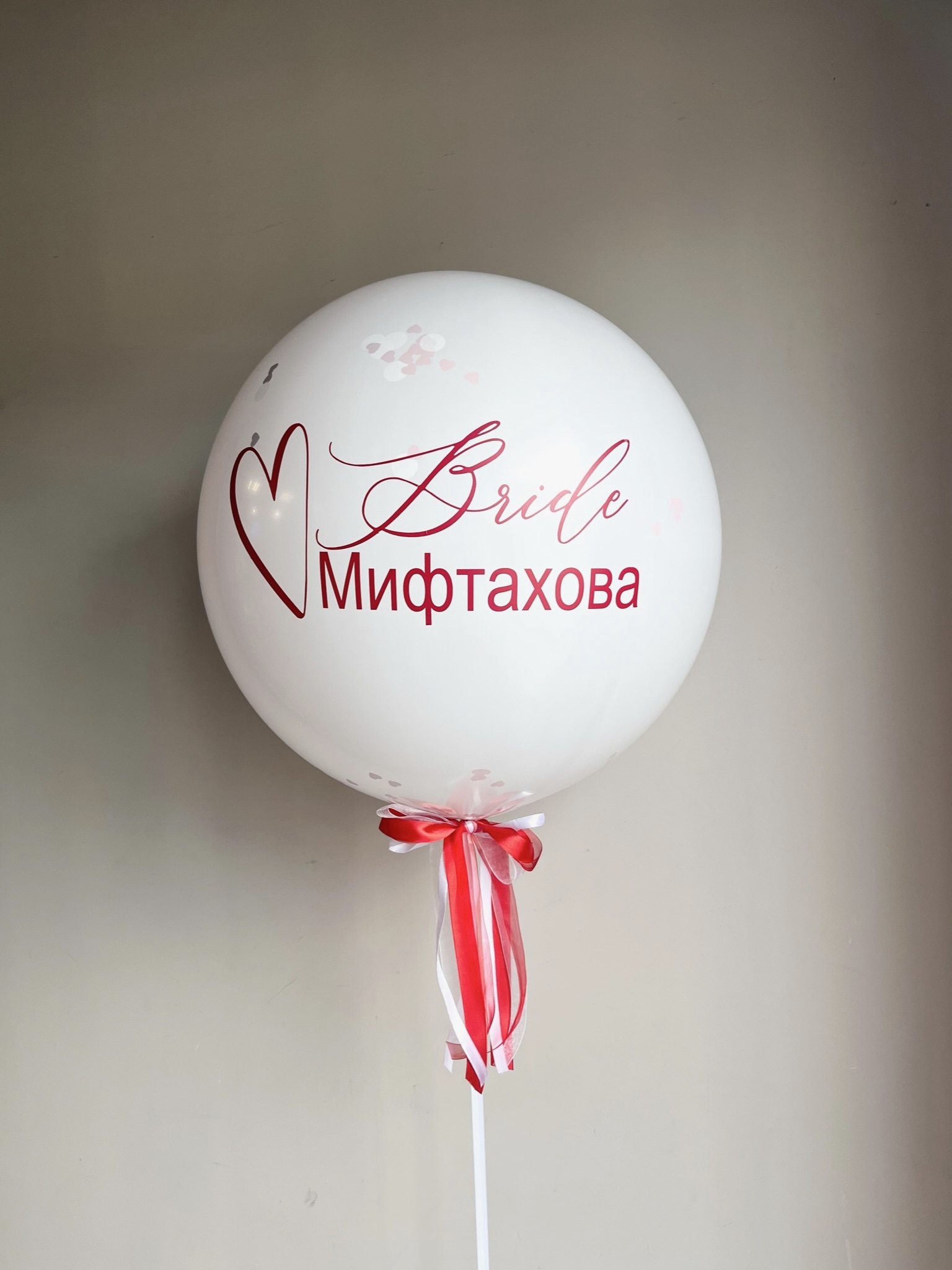Двойной шар на девичник, внешний шар с девичьей фамилией, внутри сердце 45 см с новой фамилией
