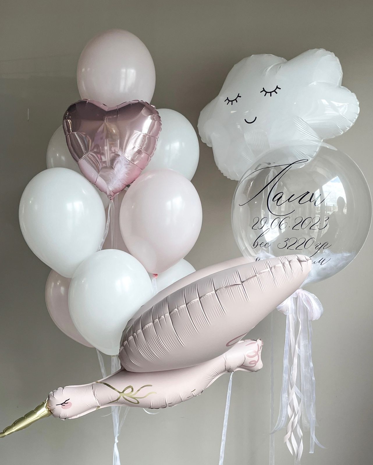 Фонтан из 10 шаров (сердце, 5 белых, 4 розовый макарунс)
