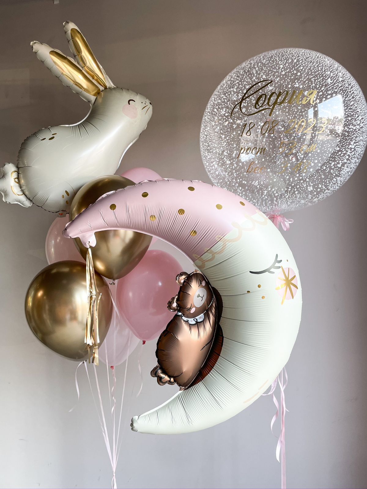 Фонтан из 7 шаров (2 бабл гам, 2 розовый макарунс, 2 хром золото, фигурка «Милый зайка»)