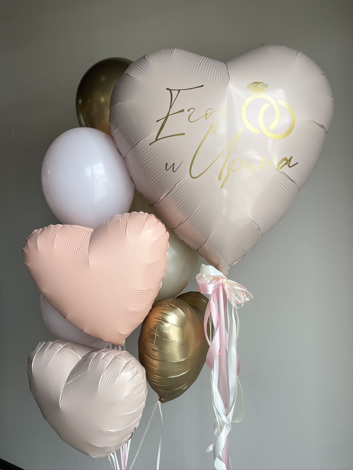 Фонтан из 8 шаров (1 сердце румяна, 1 сердце крем, 1 сердце Сатин золото, 3 белый песок, 2 розовый макарунс, 1 хром золото)
