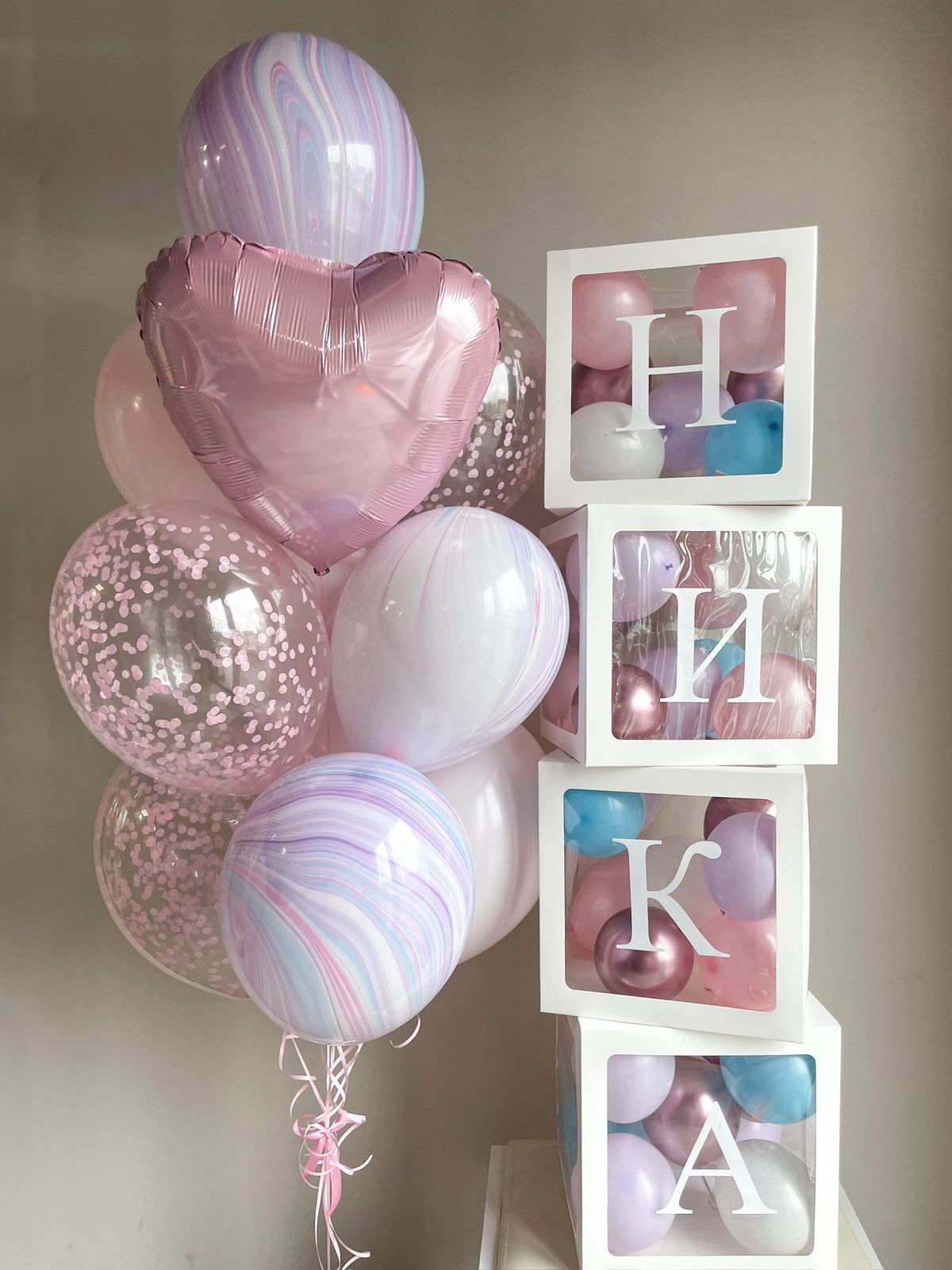 Фонтан из 10 шаров (3 агата, 3 с конфетти, 3 розовый макарунс, сердце)