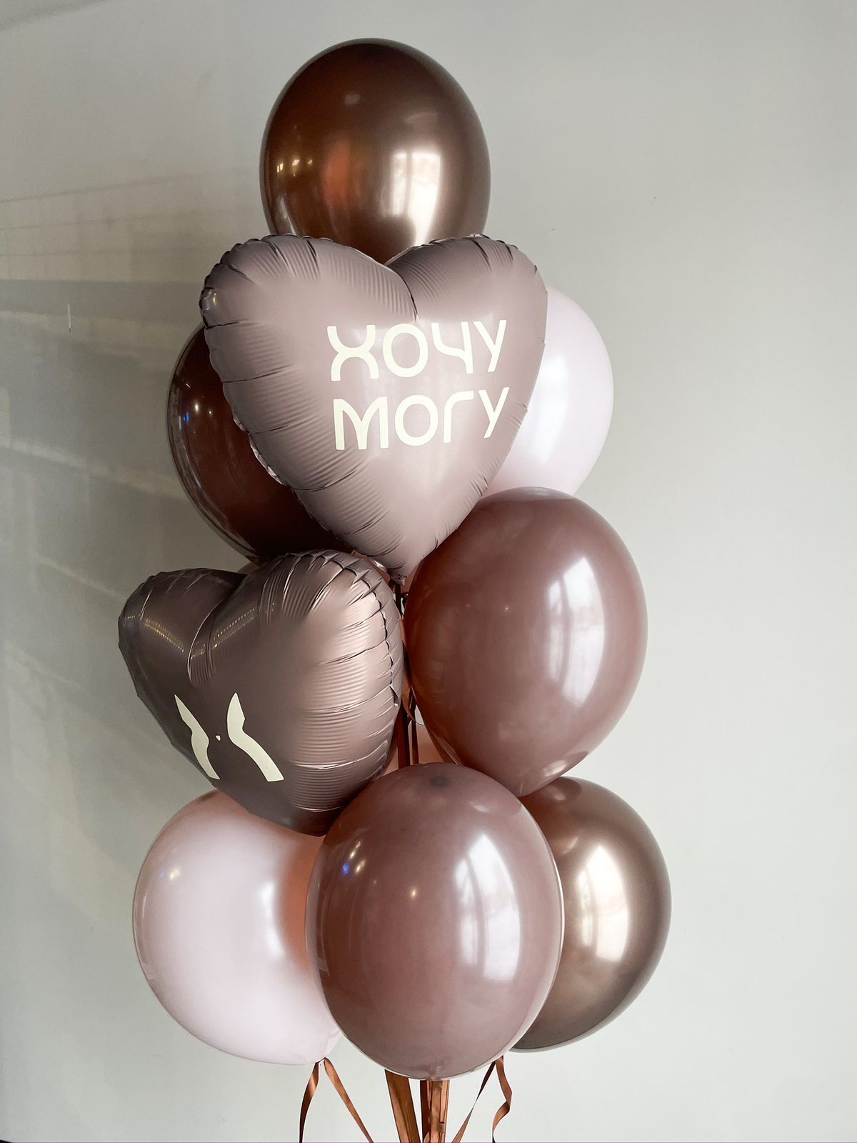 Фонтан из 6 однотонных шаров, 3 хром трюфель, 2 сердца с надписью.
