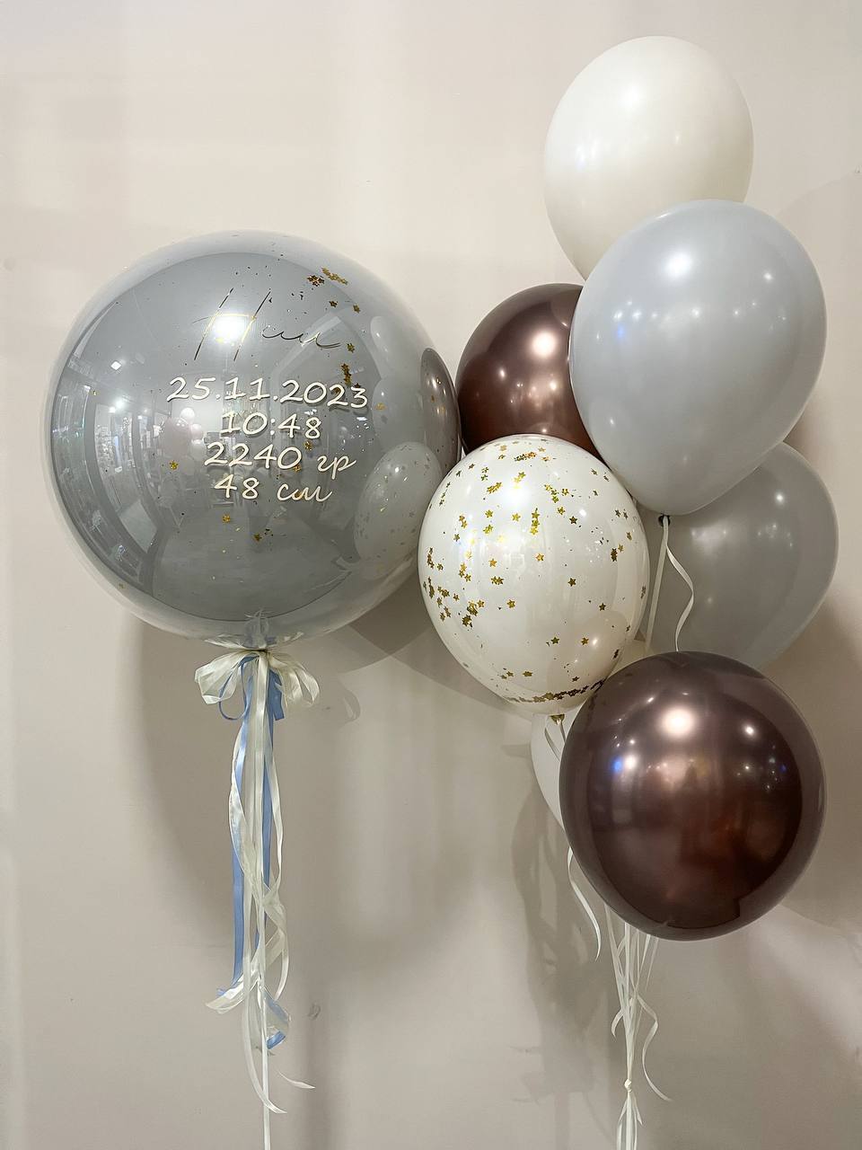 Фонтан из 7 шаров (2 ретро голубой, 2 крем, 1 крем дабл Стафф с конфетти, 2 хром трюфель)