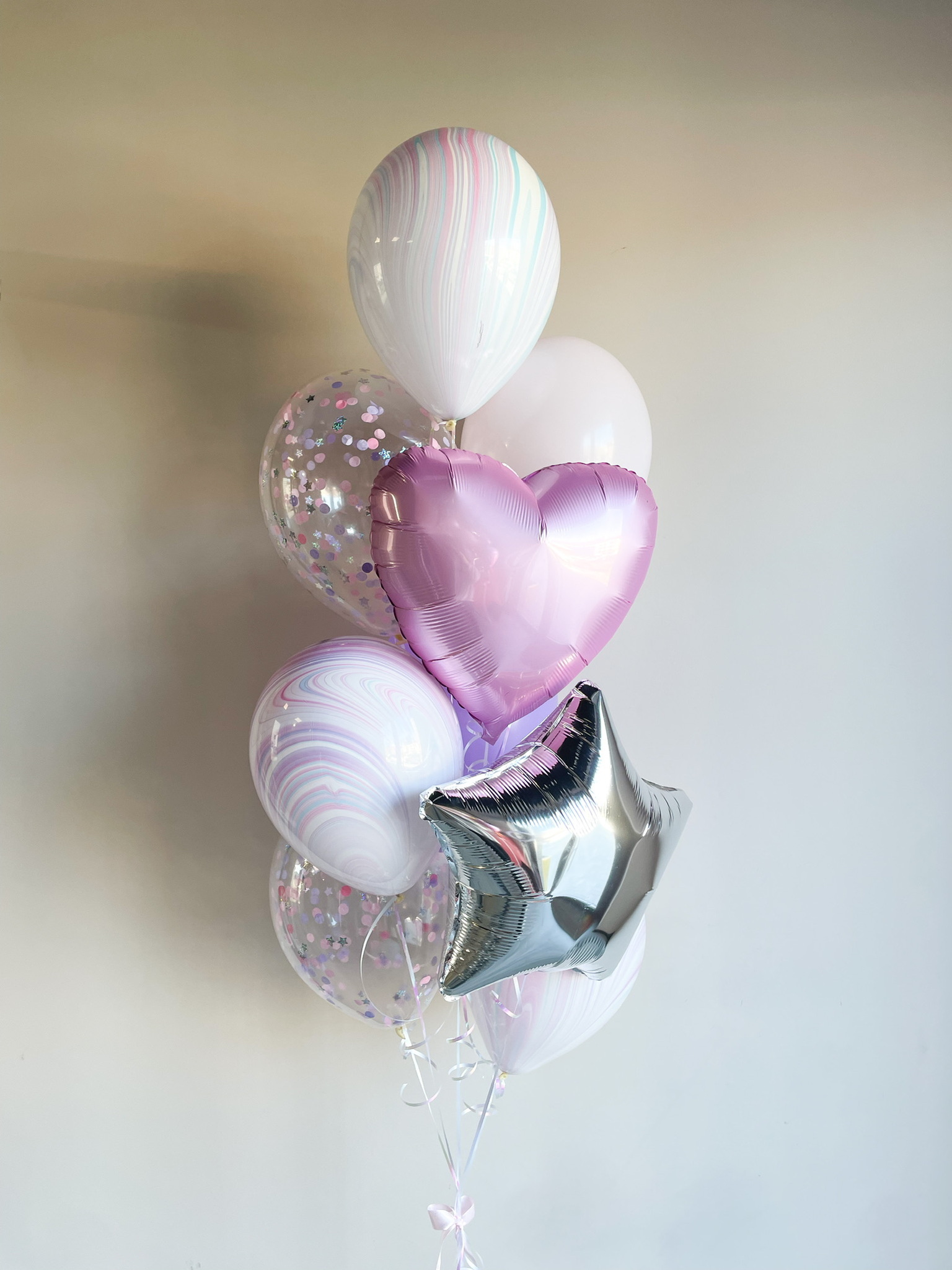 - Фонтан из 9 шаров: сердце, звезда, 3 агата, 2 с конфетти, 2 однотонных