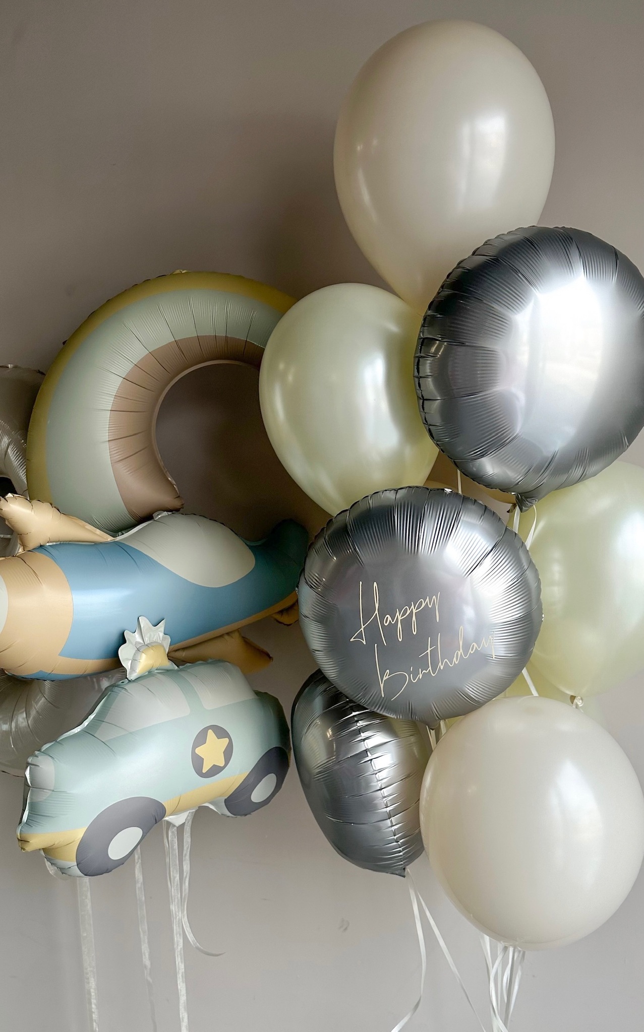 Фонтан из 10 шаров (3 круга Сатин платина, на одном из кругов индивидуальная надпись, 3 дабл Стафф желтый макарунс и белый перламутр, 4 белый песок)