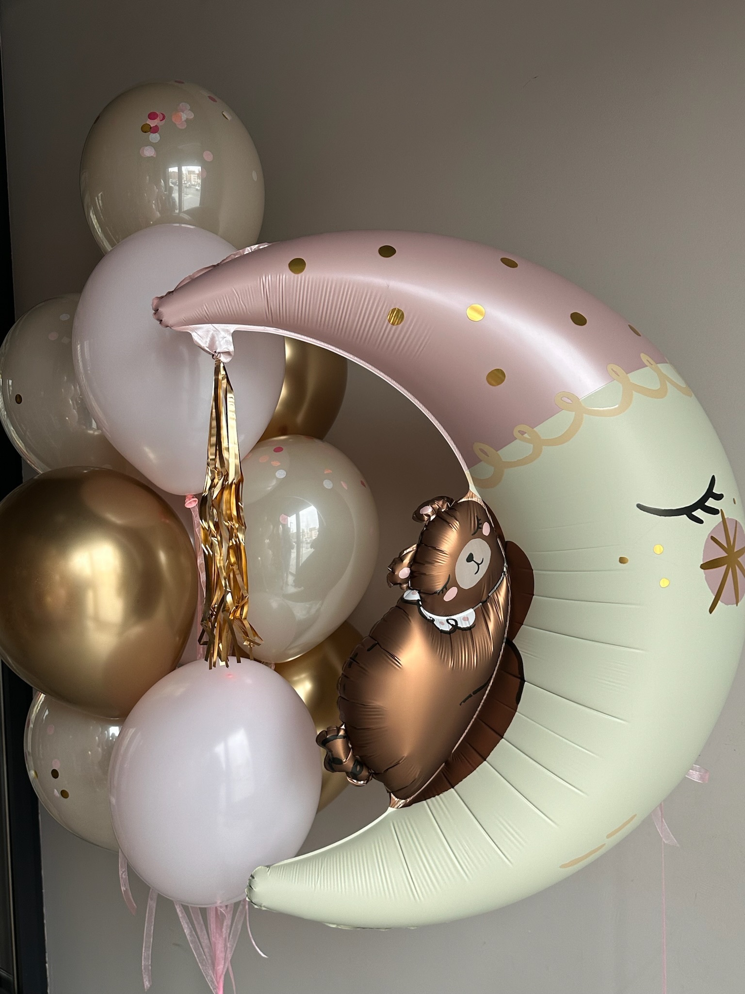 Фонтан из 10 шаров (4 белый песок дабл стафф с конфетти, 3 розовый макарунс, 3 хром золото)