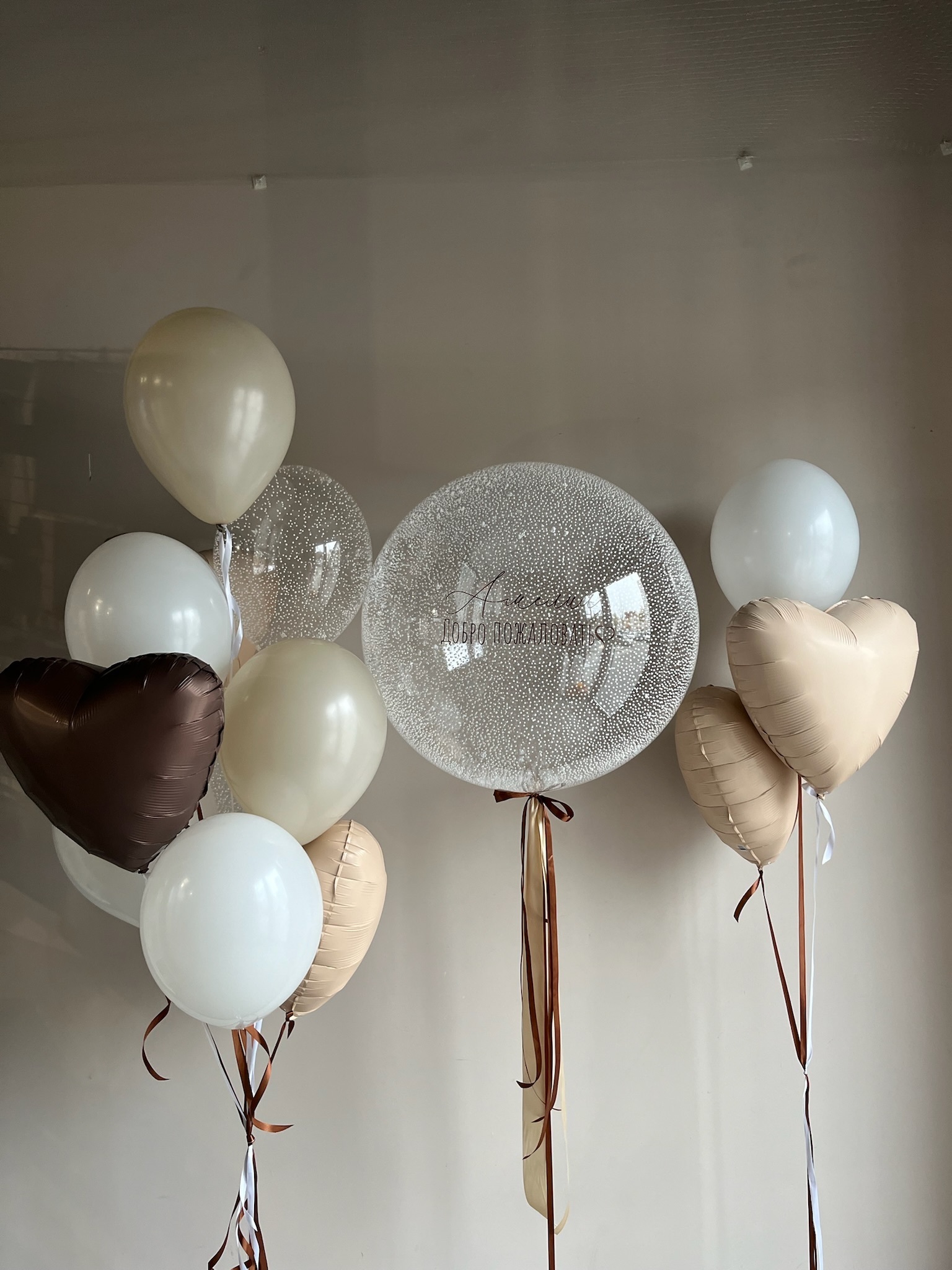 Фонтан из 10 шаров сердце какао, 2 сердца тон, 2 прозрачных с пенопластом, 2 белый песок, 3 белых)