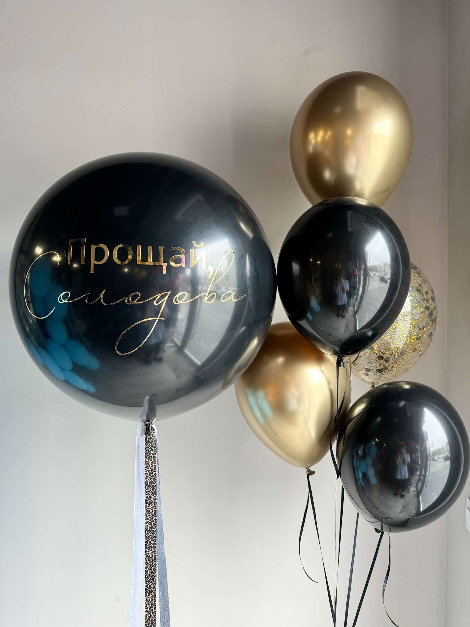 Фонтан из 5 шаров (2 хром золото, 2 черных, 1 прозрачный с конфетти)
