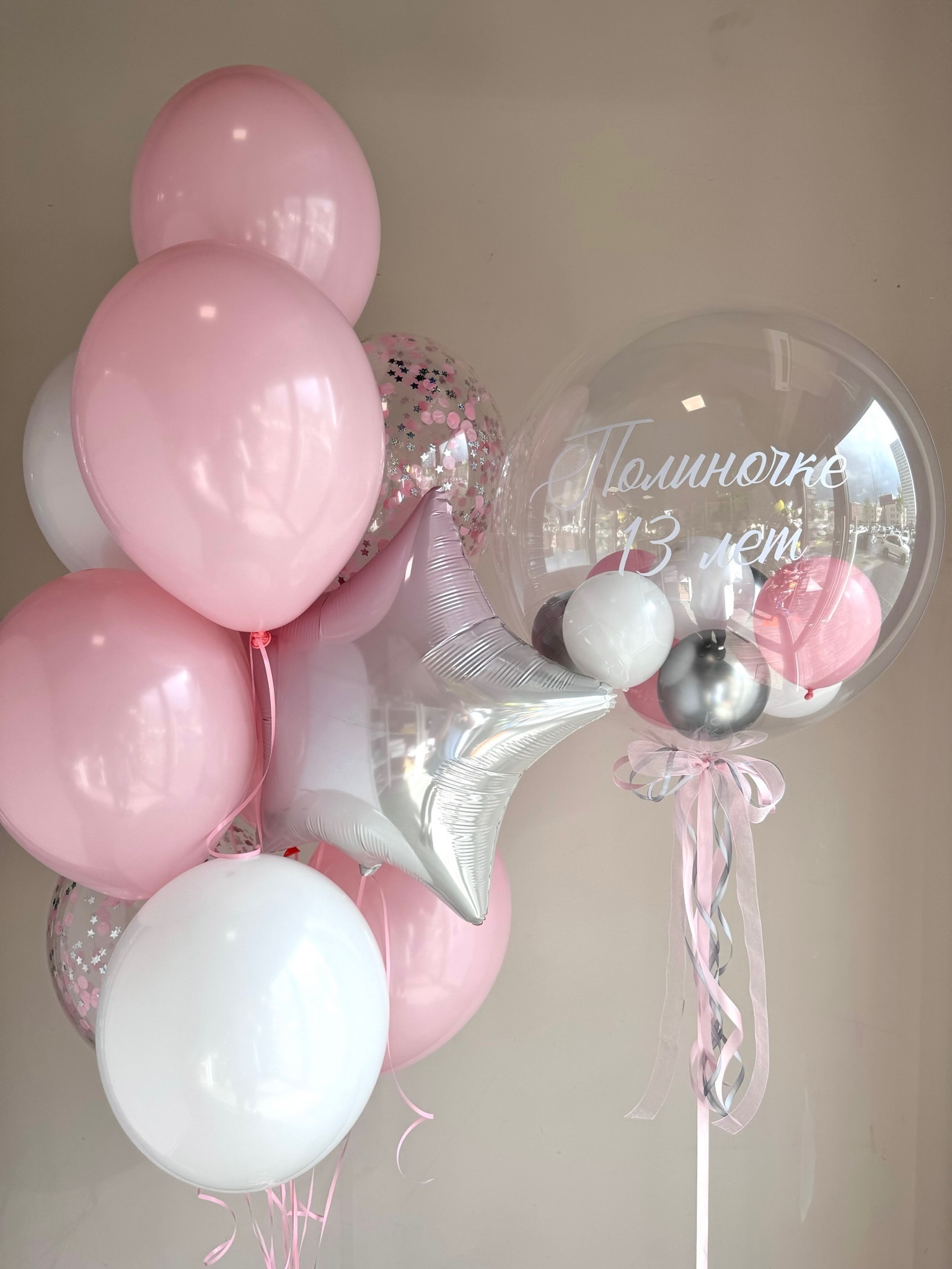 Фонтан из 10 шаров (4 бабл гам, 3 белых, 2 прозрачных с конфетти, звезда градиент)