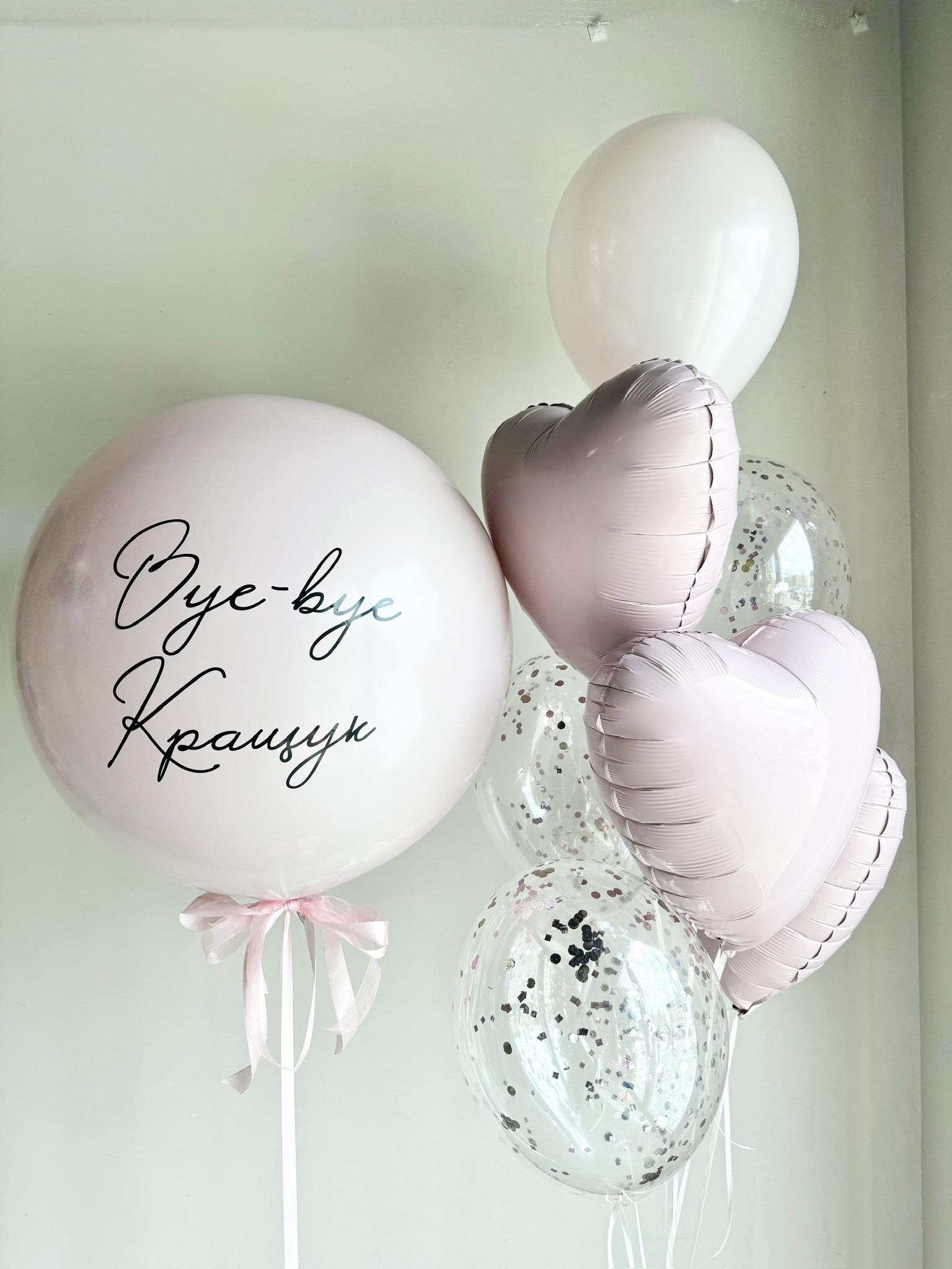 Фонтан из 7 шаров (3 сердца пыльная Роза, 3 с конфетти, 1 латекс пыльная Роза)