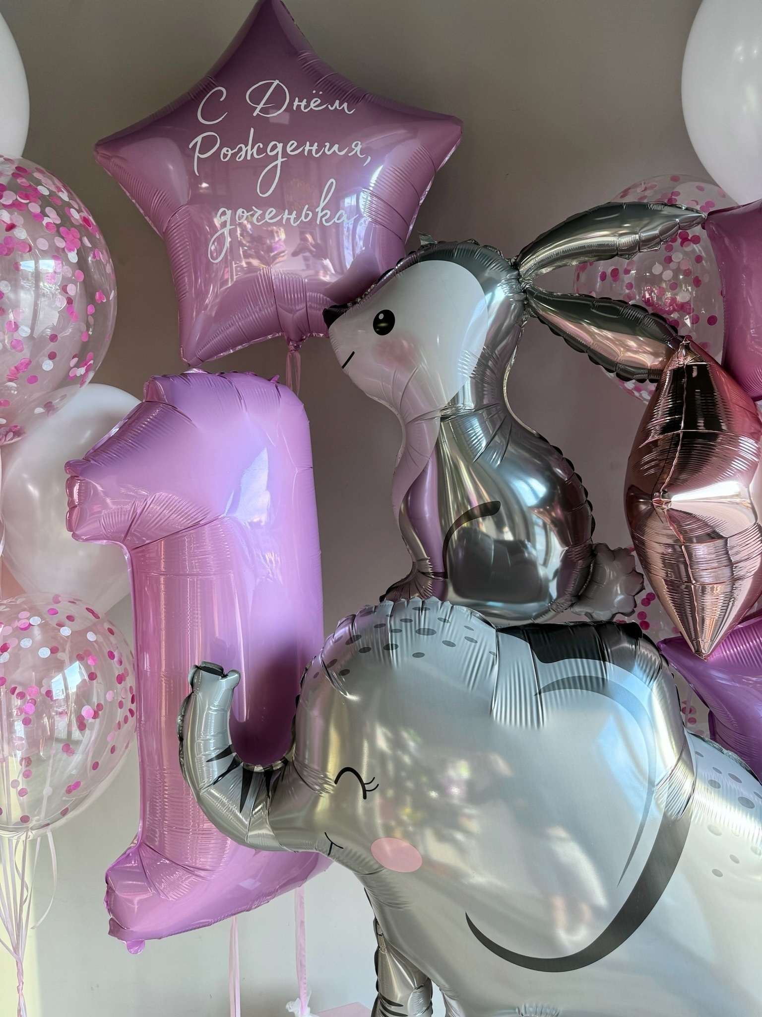 Два фонтана по 10 Шаров (2 розовых звезды, 1 звезда розовое золото, 3 прозрачных с конфетти, 2 белых, 2 розовый макарунс)