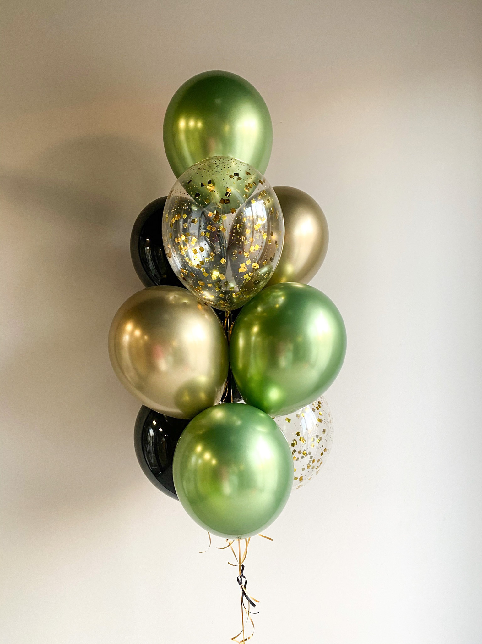 Фонтан из 10 шаров (3 черных, 3 хром лайм, 2 хром золото, 2 прозрачных с конфетти)