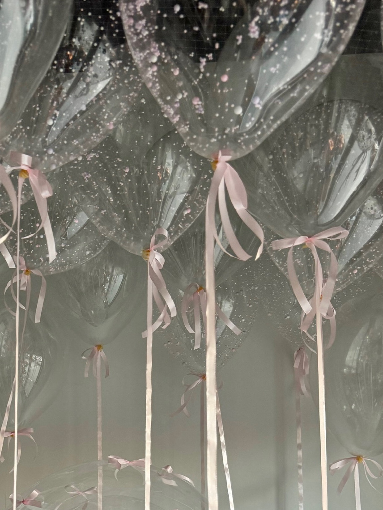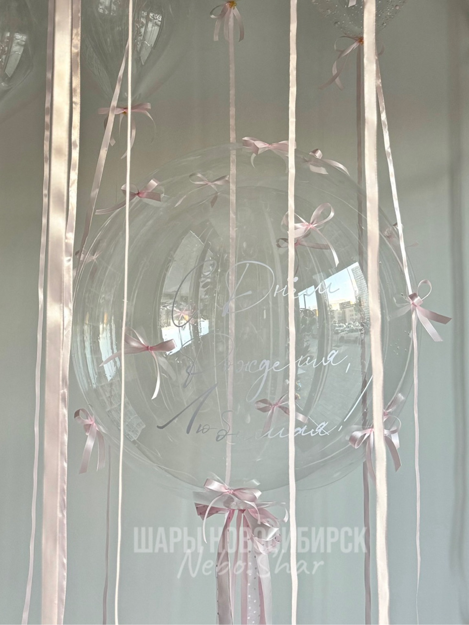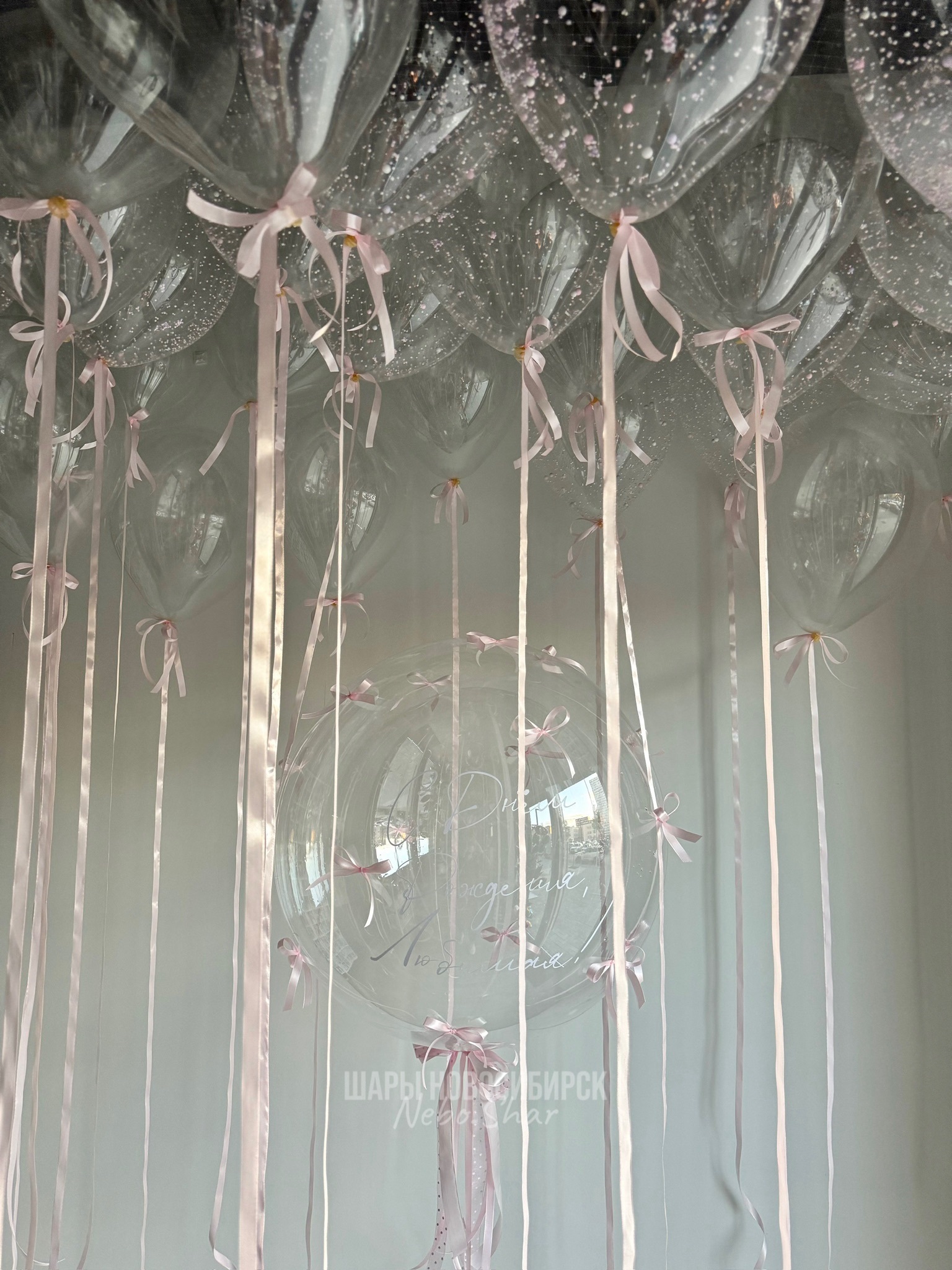 25 Шаров под потолок с бантиками снизу шара ( 13 прозрачных с пенопластом, 12 прозрачных без наполнения)