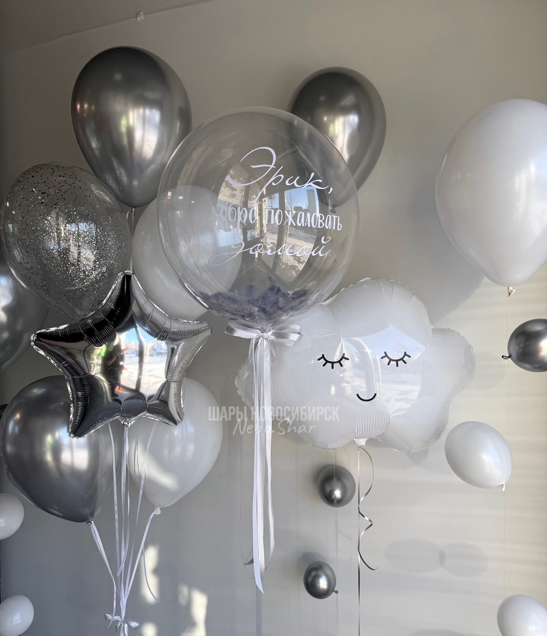 Фонтан из 7 шаров (звезда, 2 хром серебро, 3 белых, 1 прозрачный с конфетти)