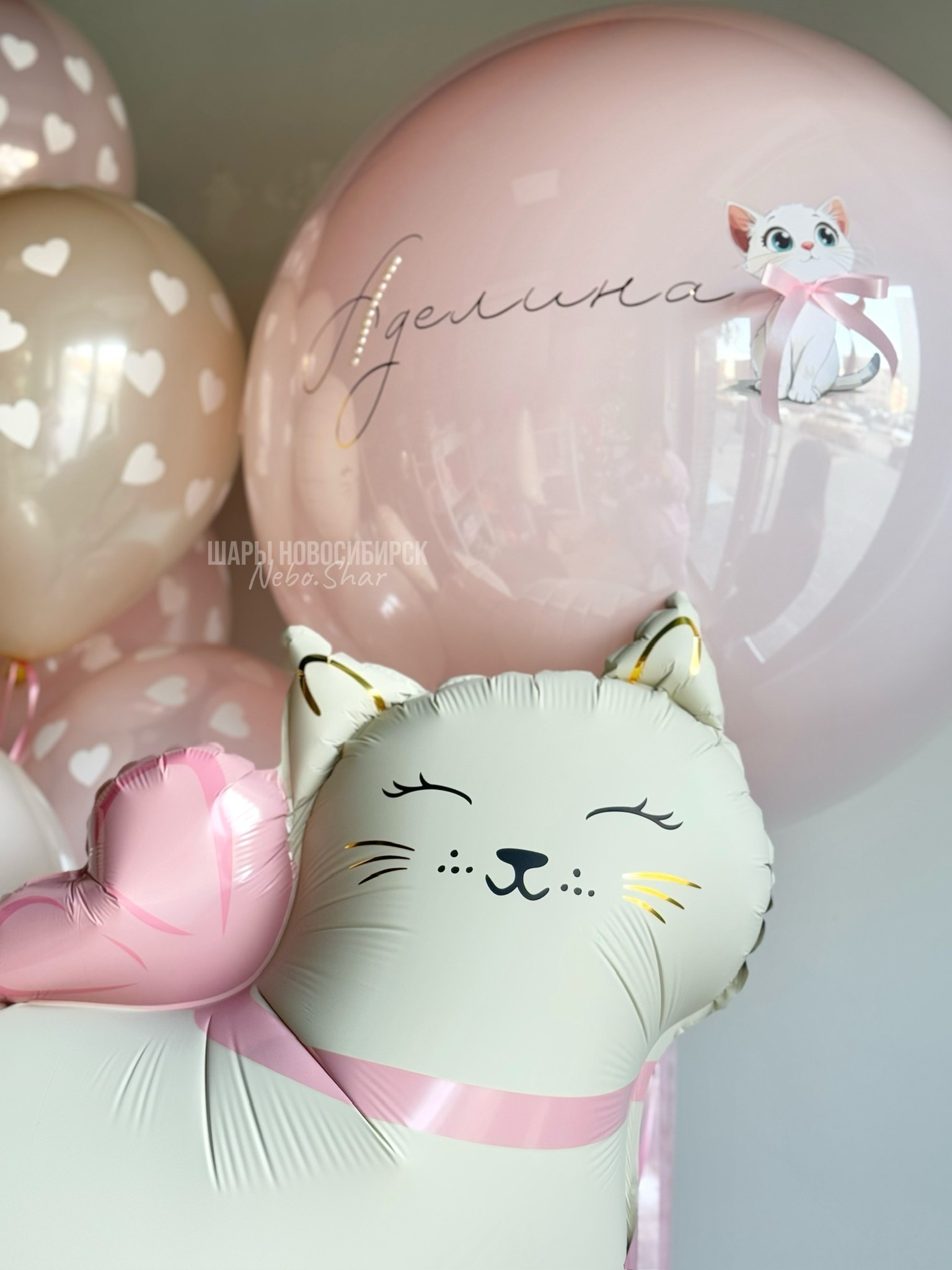 Стеклянный шар розовый макарунс с надписью и картинкой кошечки