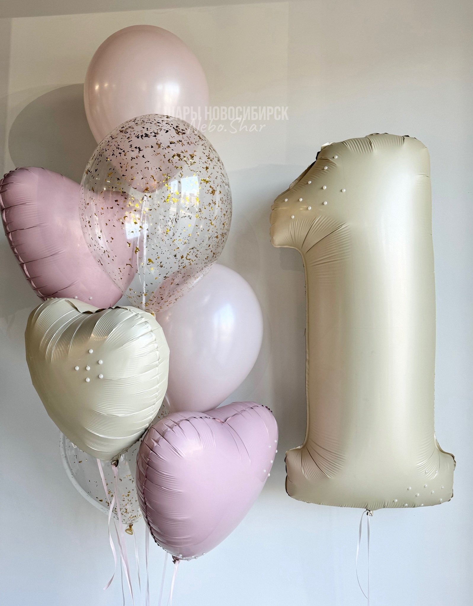 Фонтан из 7 шаров (2 сердца пыльная Роза, 1 кремовое сердце, 2 латекс пыльная Роза, 2 прозрачных с конфетти)