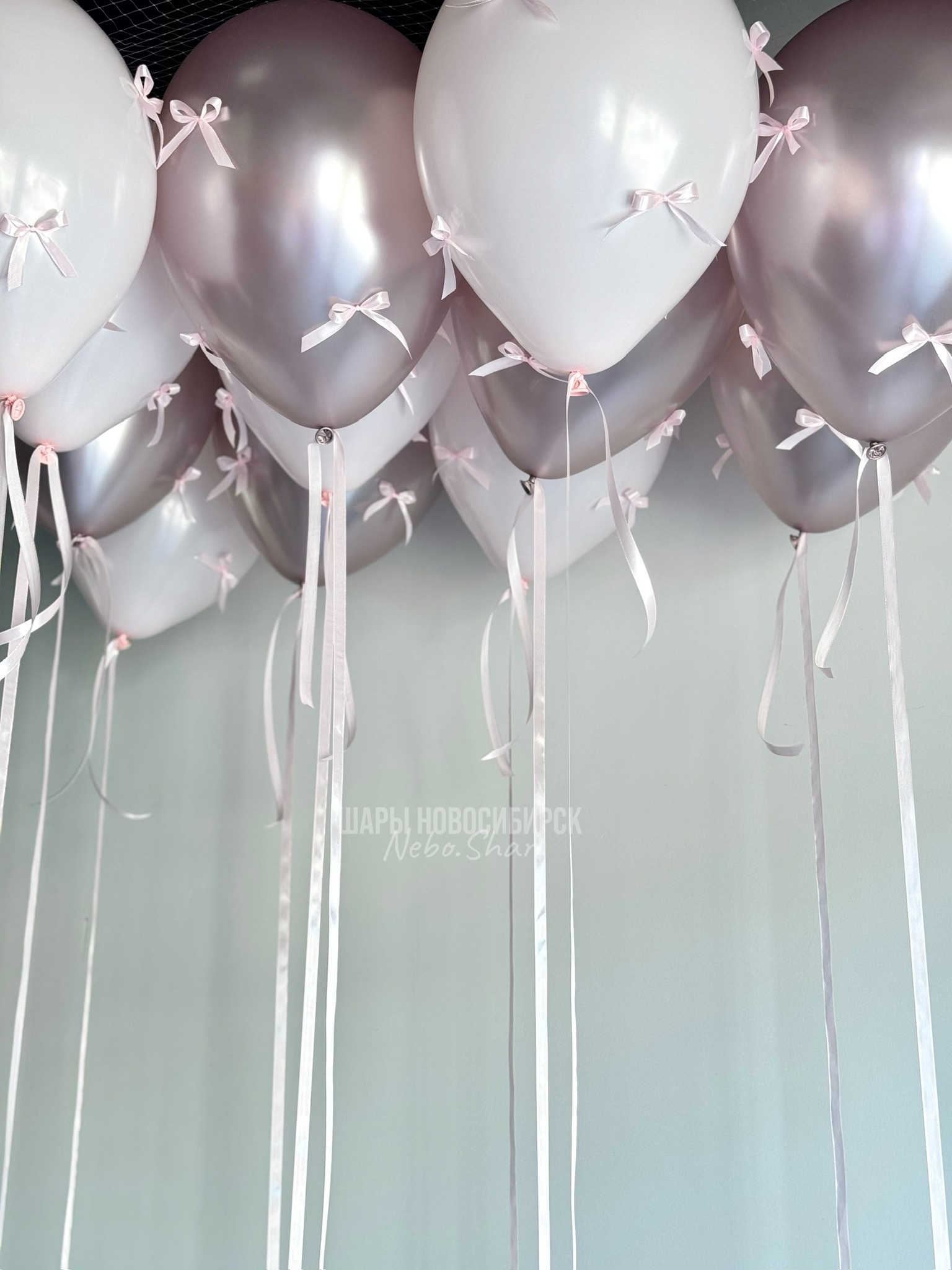 12 шаров под потолок с бантиками по цвету шару (6 хром розовый цветок, 6 розовый макарунс)