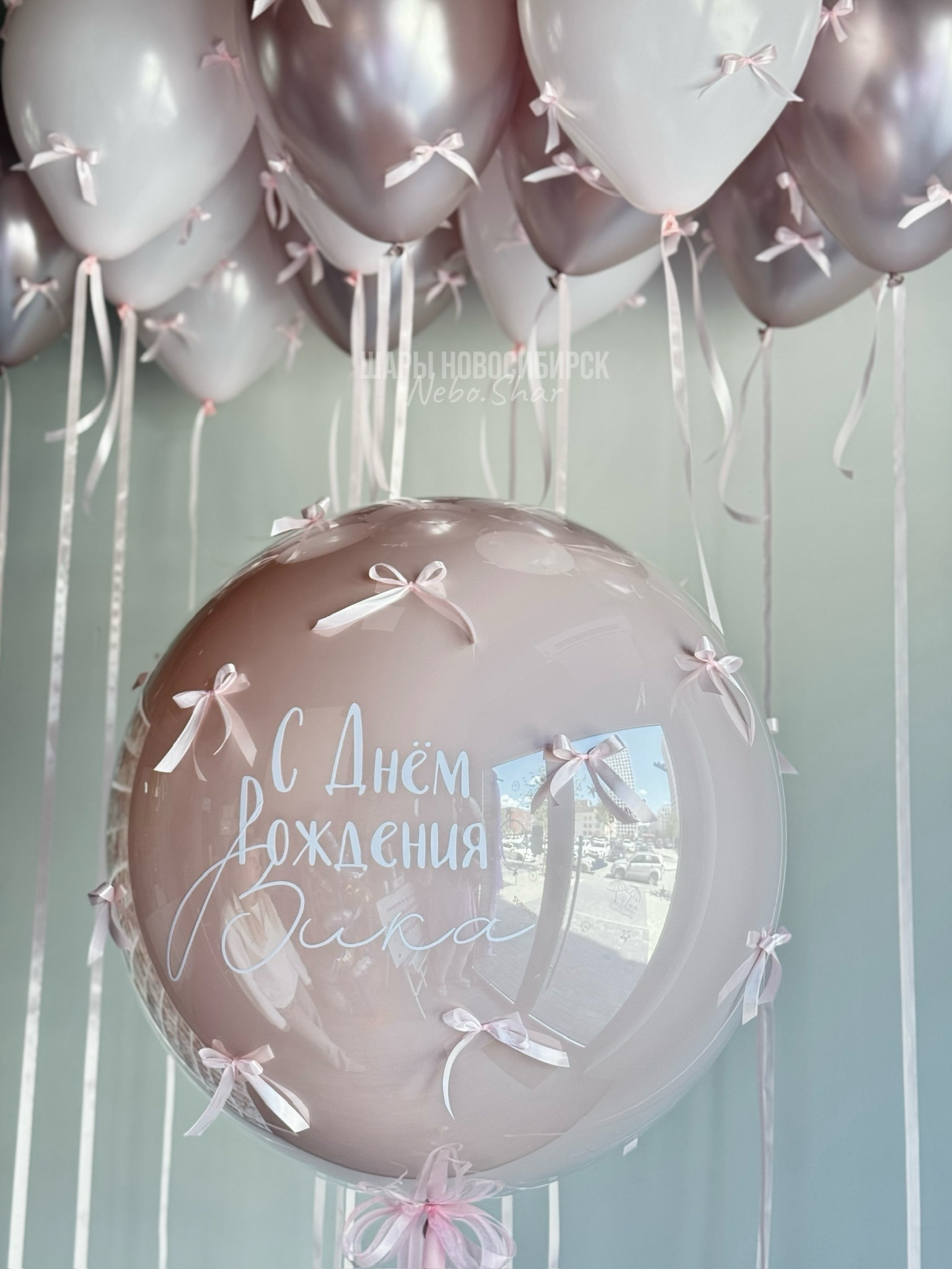 Стеклянный шар пыльная Роза 60 см с надписью и бантиками по всему шару