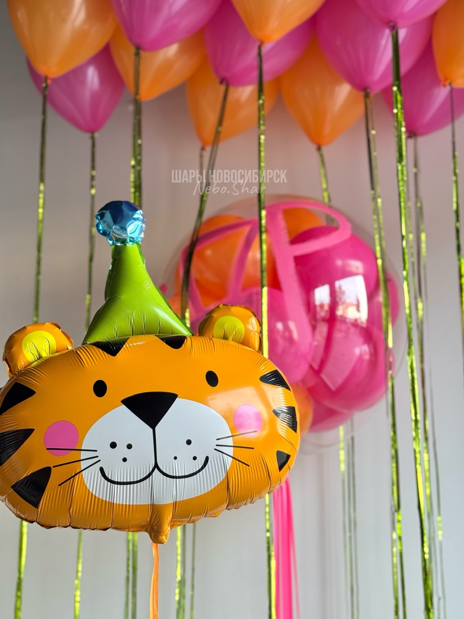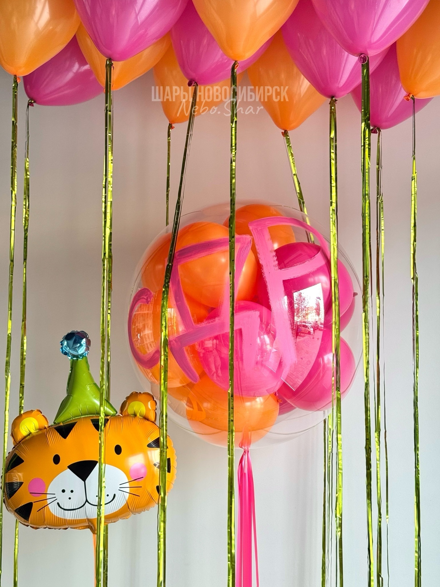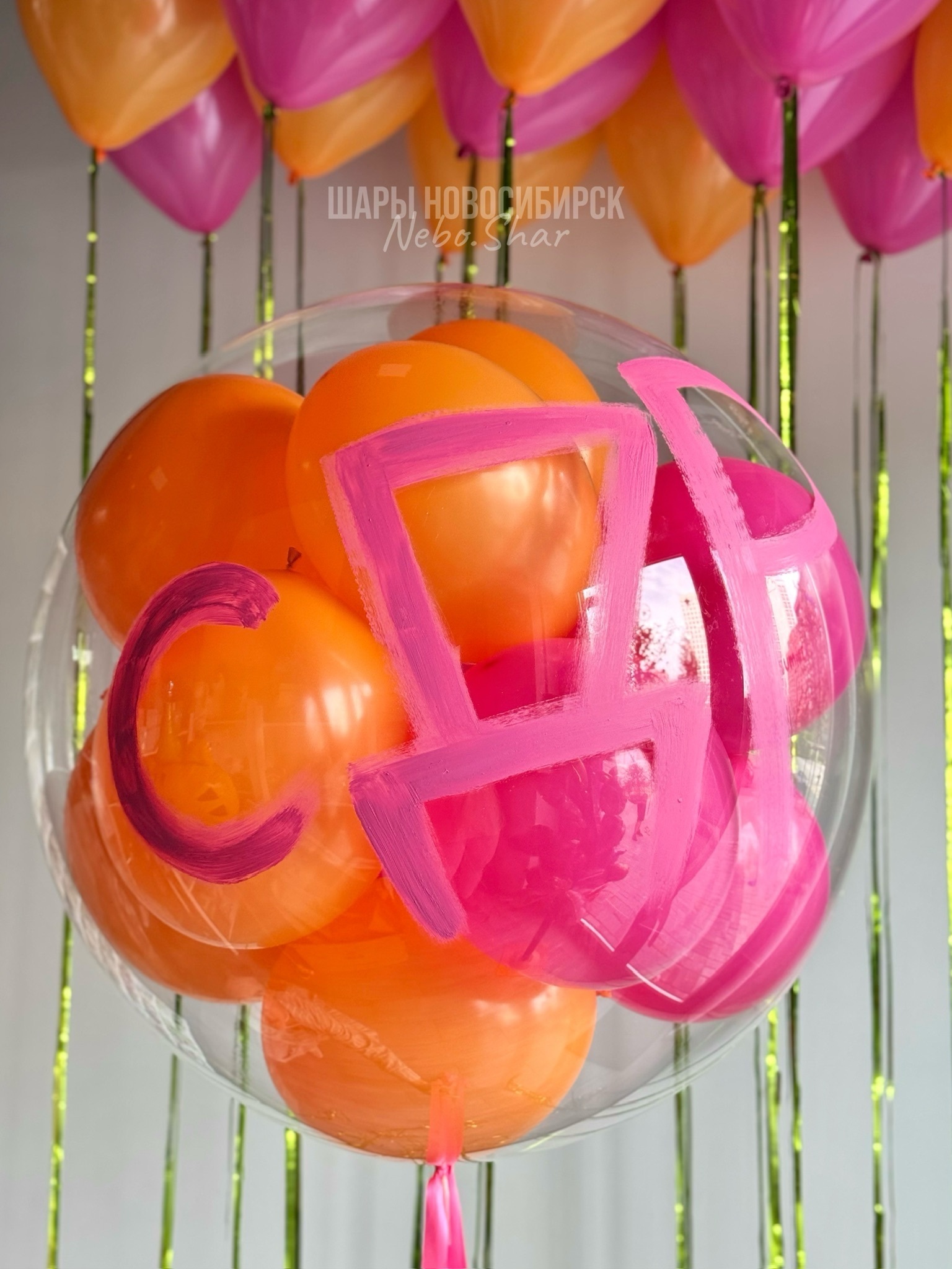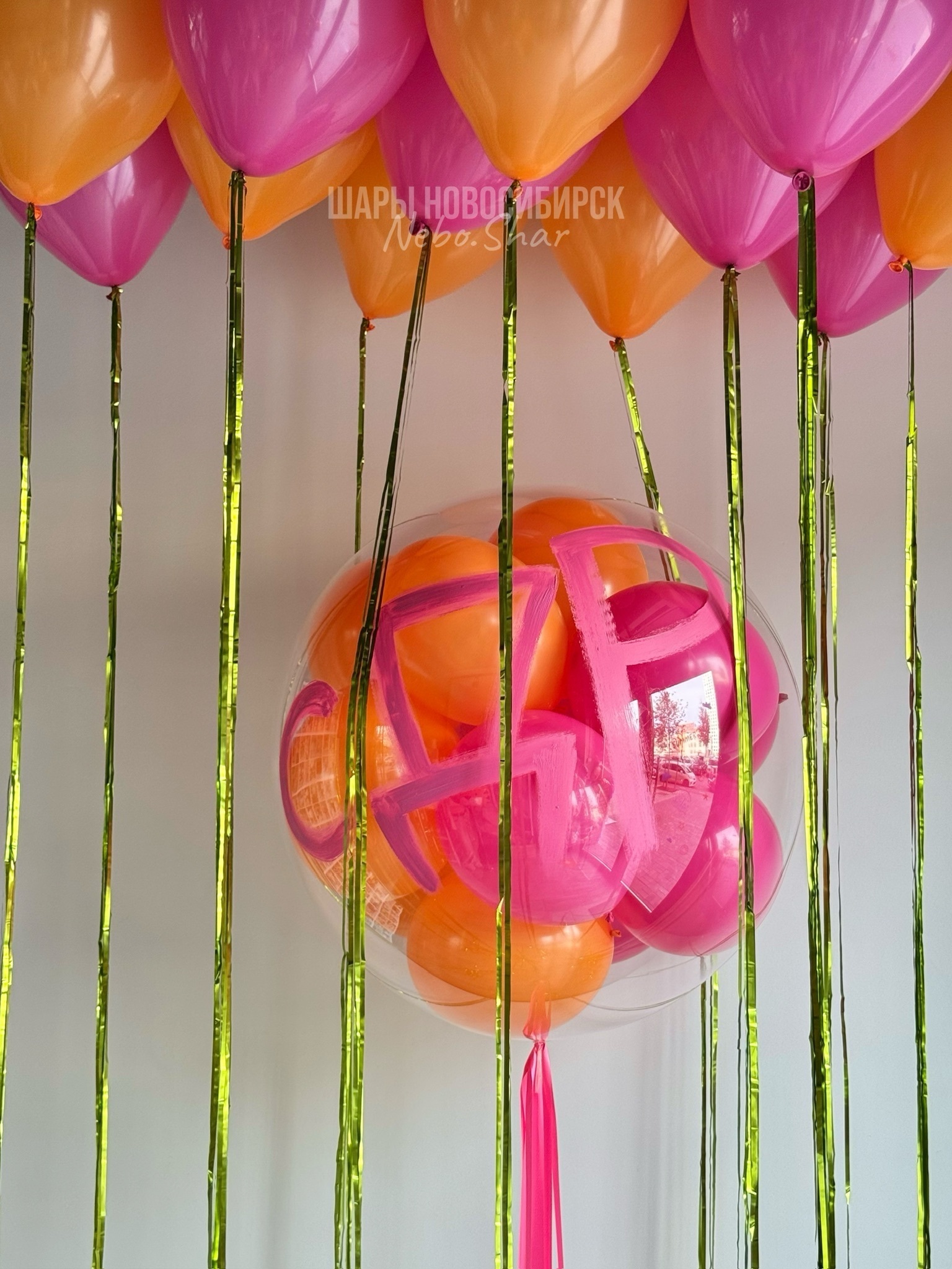 12 Шаров под потолок в гамме фуксия и оранжевый на дождике