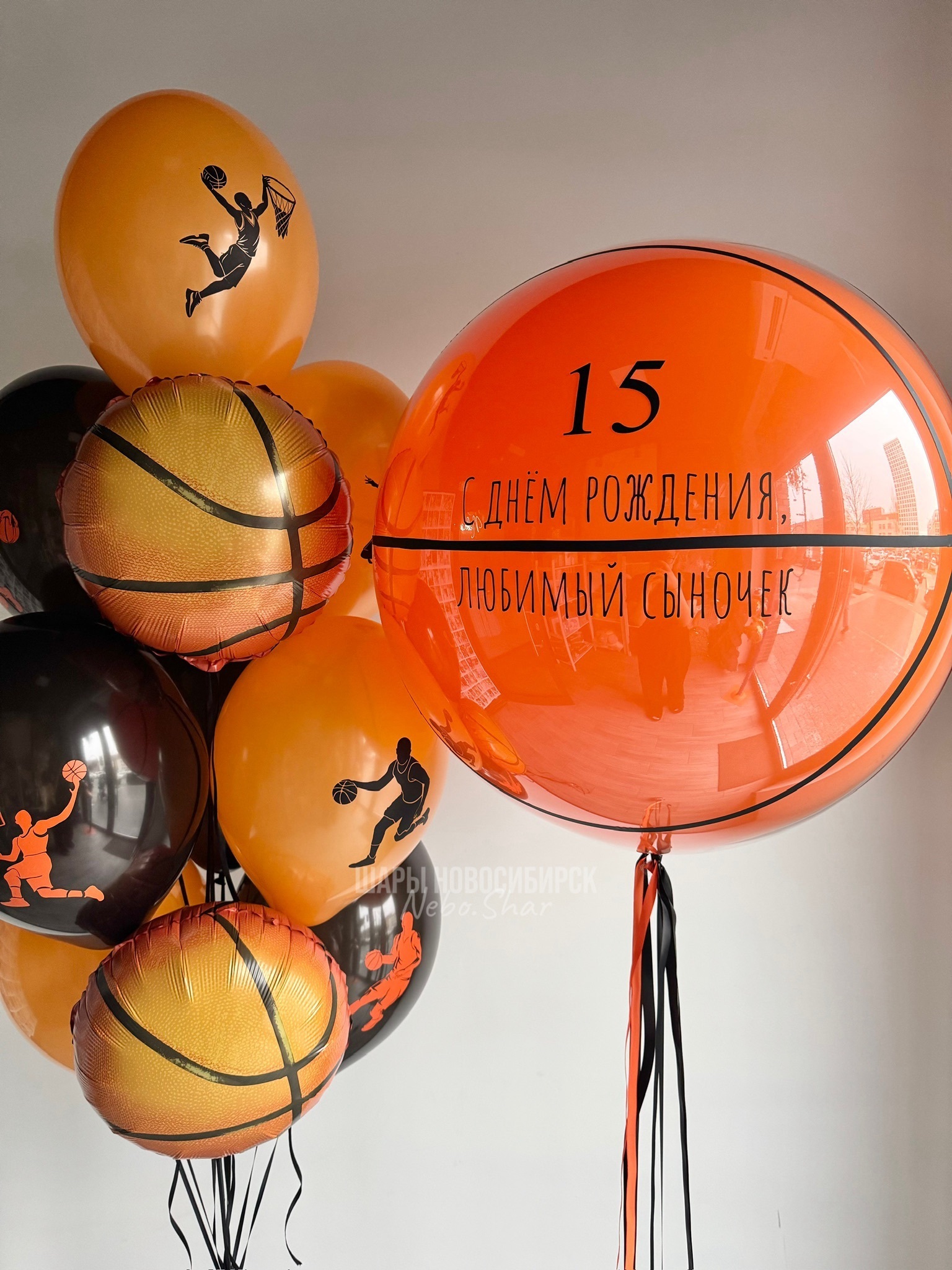 Стеклянный оранжевый шар 60 см с надписью и наклейками в виде баскетбольного мяча