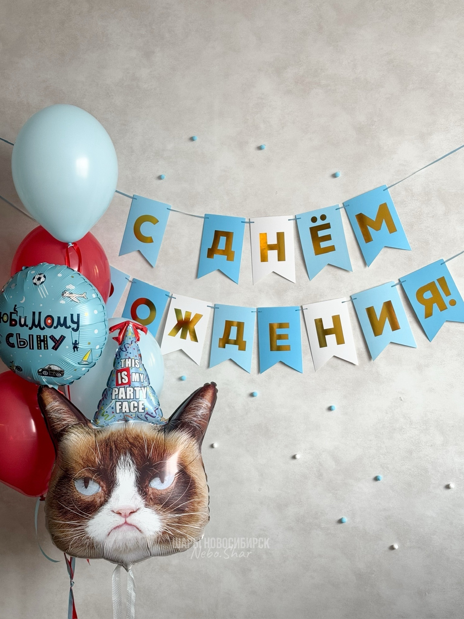 Фонтан из 5 шаров (2 голубой макарупс, 2 красных, 1 круг с готовой надписью)