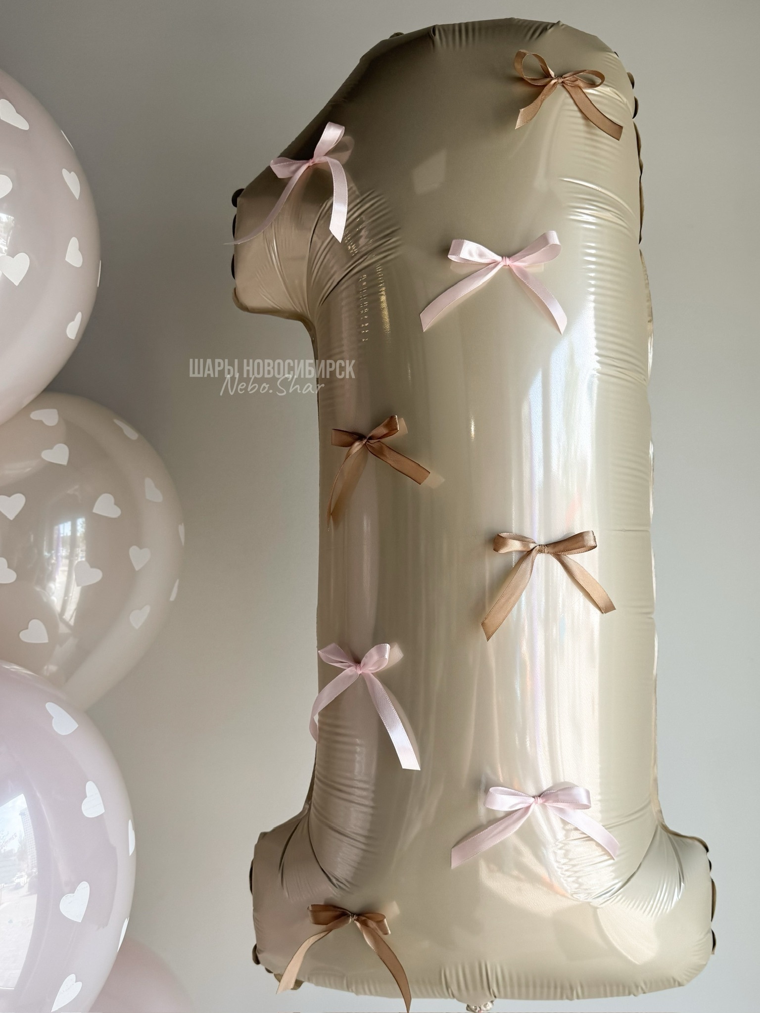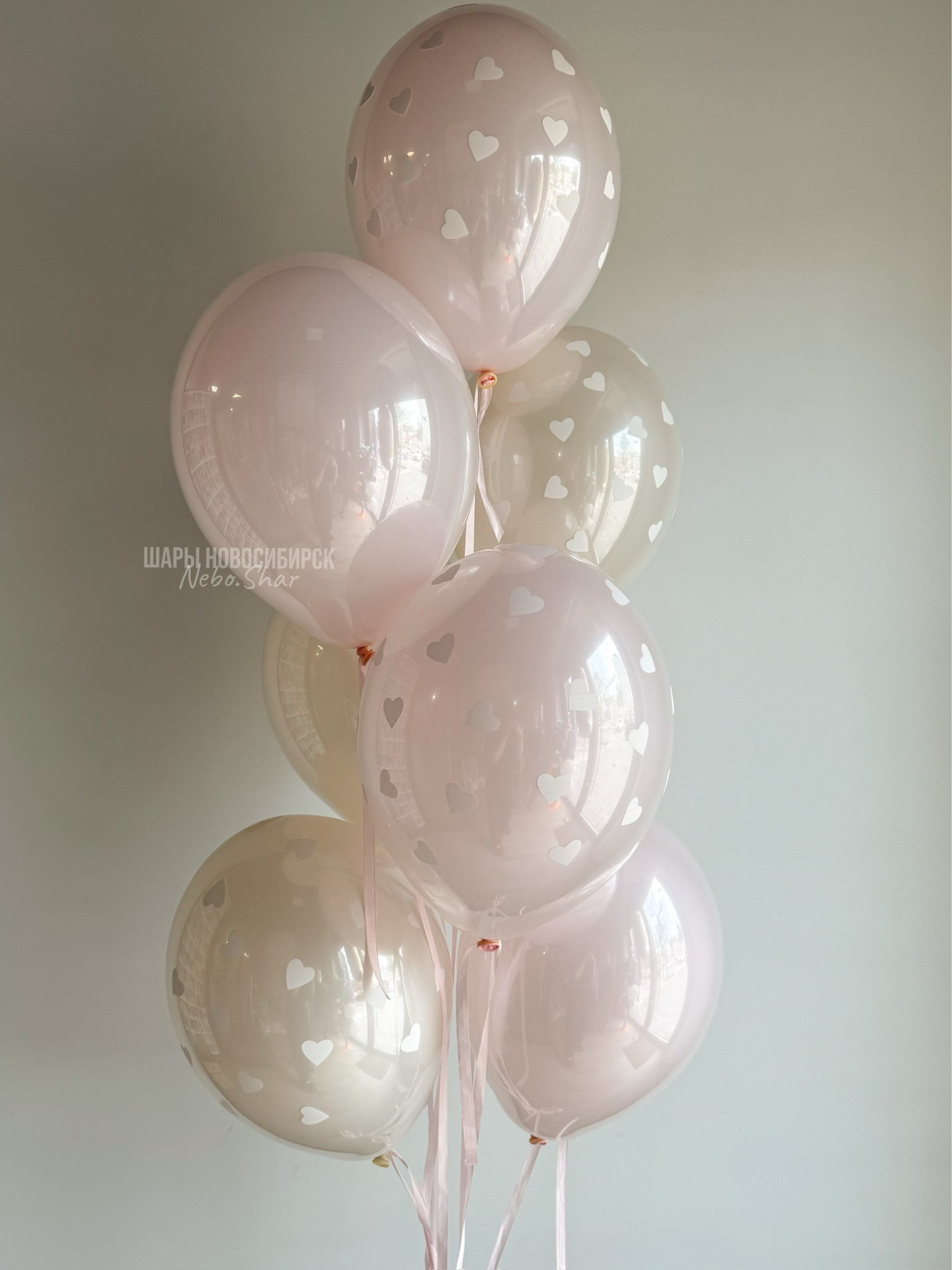 Фонтан из 7 шаров дабл стафф в гамме белый песок и розовый макарунс (4 с сердечками, 3 прозрачные)