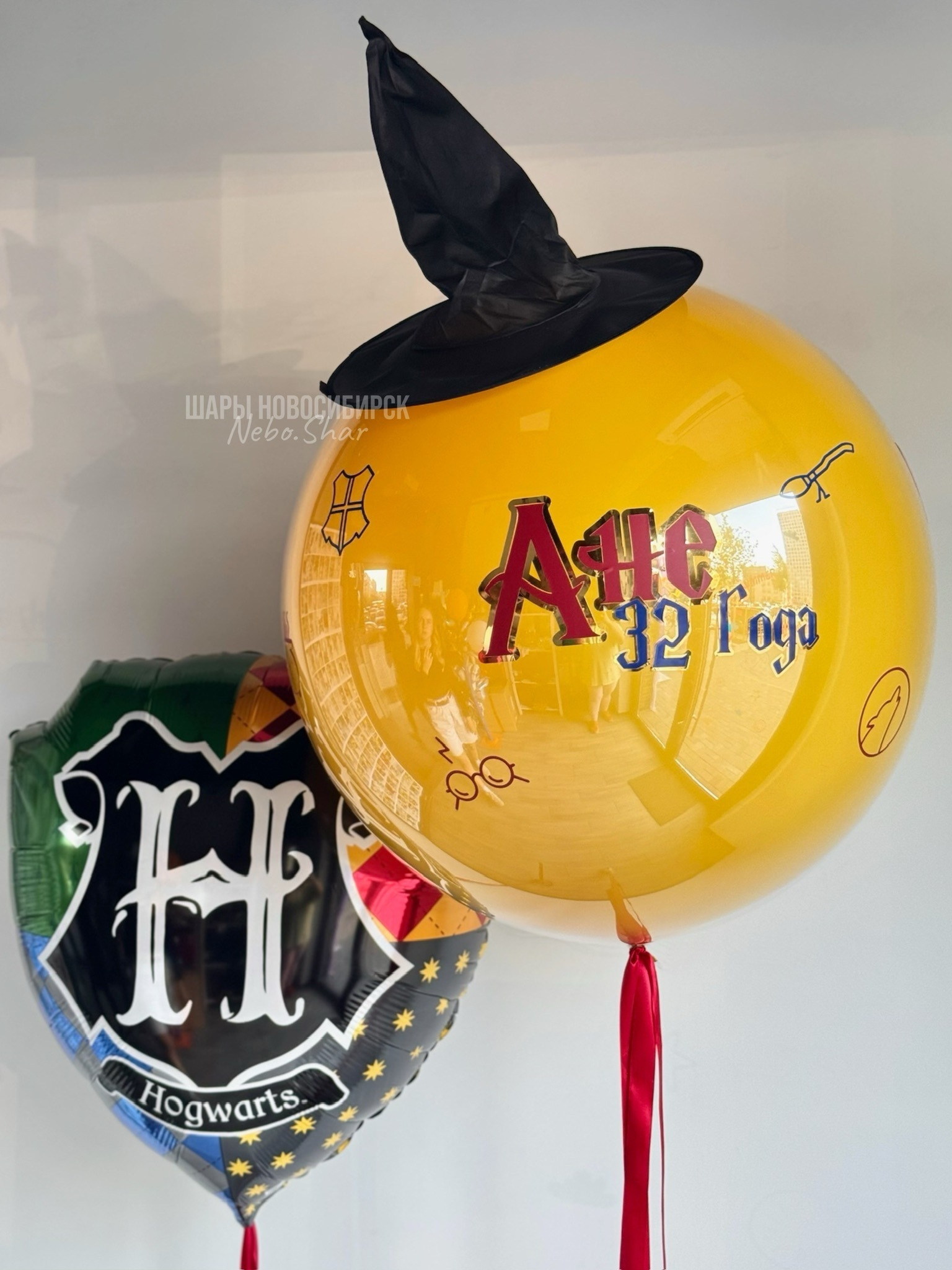 Стеклянный шар горчица 60 см с надписью, наклейками и шляпой