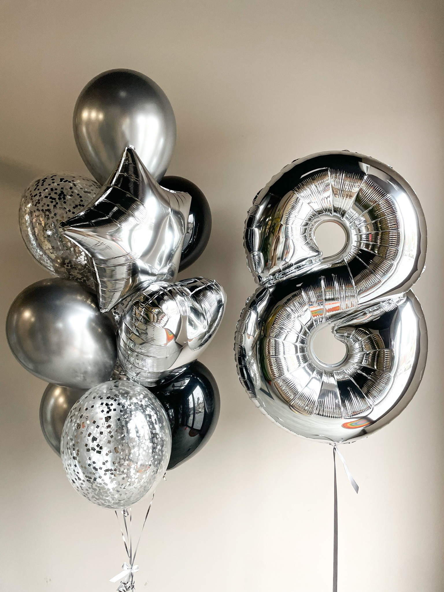 Фонтан из 10 шаров (звезда 45 см серебро, сердце 45 серебро, 2 черный, 3 хром серебро, 3 с конфетти)