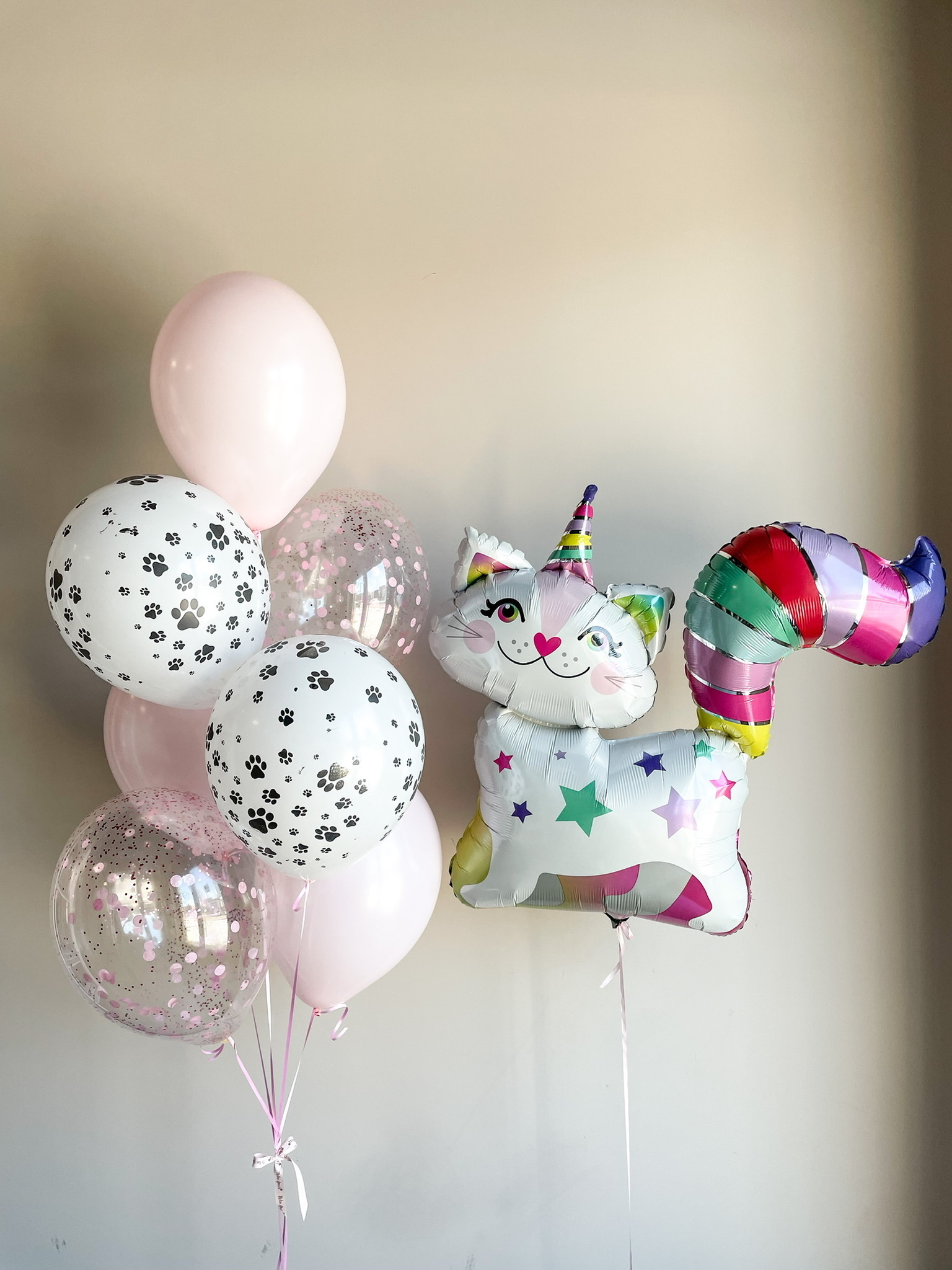 - Фонтан из 7 шаров:2 с конфетти, 2 с рисунком и 3 однотонных.
