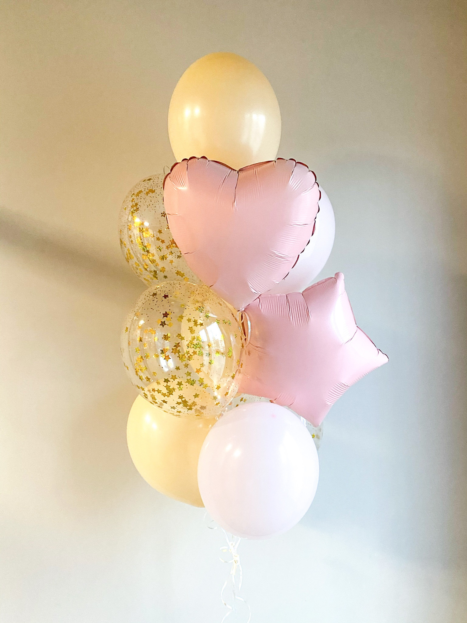 - Фонтан из 10 шаров: звезда, сердце, 2 с конфетти и 6 однотонных