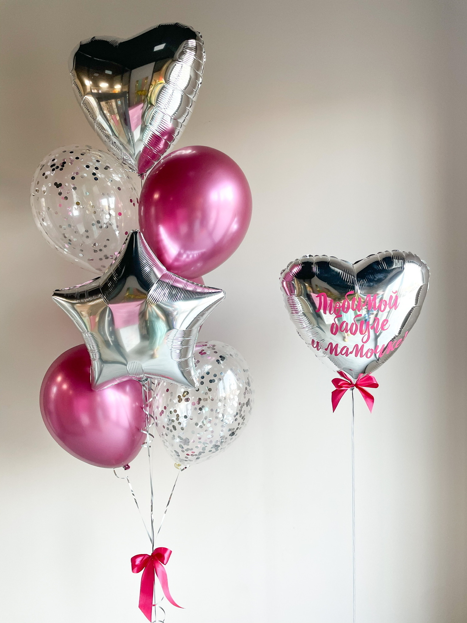 - Фонтан из 7 шаров: сердце, звезда, 2 с конфетти и 3 хром