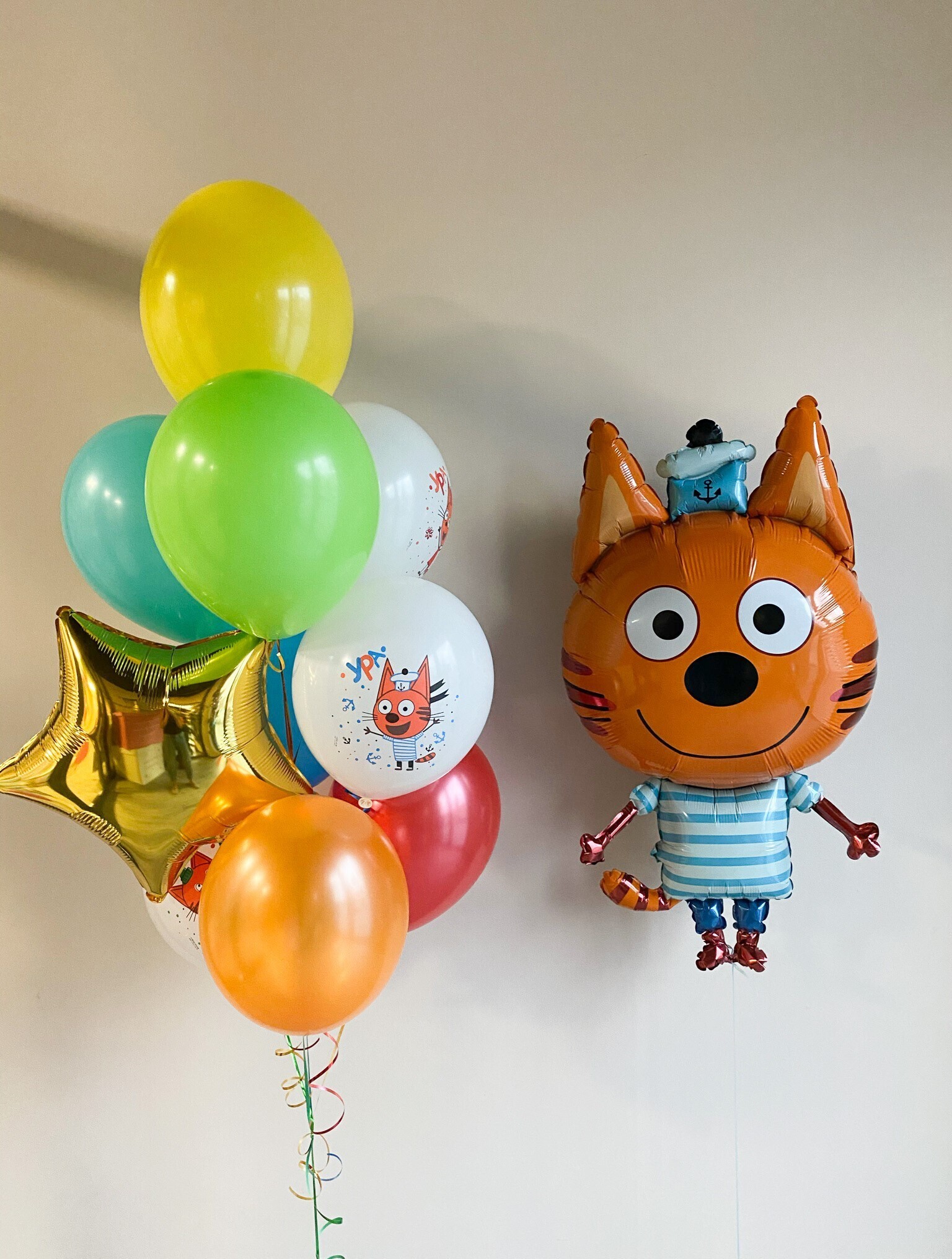 - Фонтан из 10 шаров: звезда, 3 с рисунком и 6 однотонных