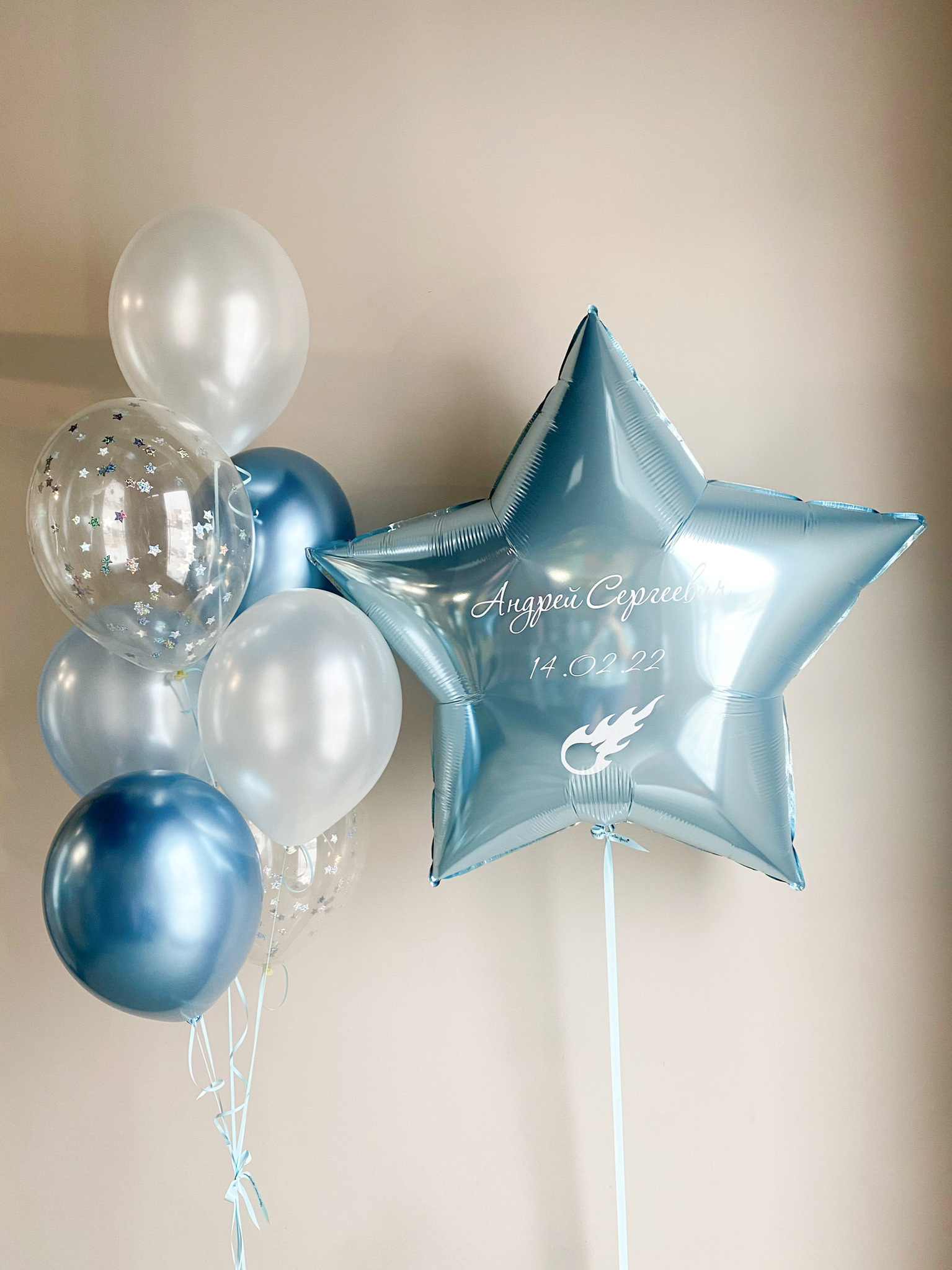 Фонтан из 7 шаров (2 хром синий, 2 белый перламутр, 1 голубой перламутр, 2 прозрачных с конфетти)