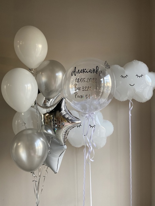 Шар бабл с перьями с индивидуальной надписью/метриками