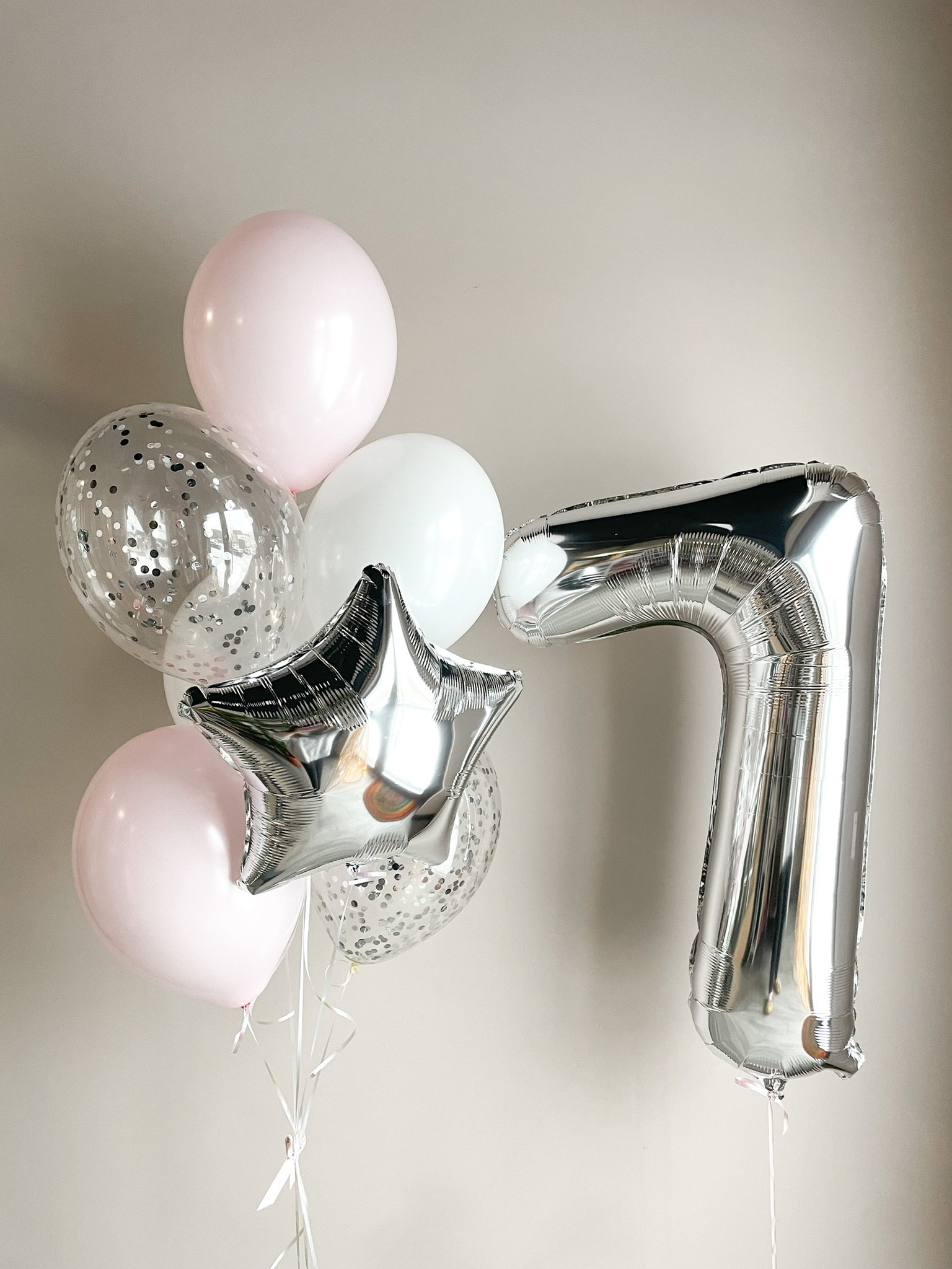 - Фонтан из 7 шаров: звезда, 2 с конфетти, 4 однотонных.