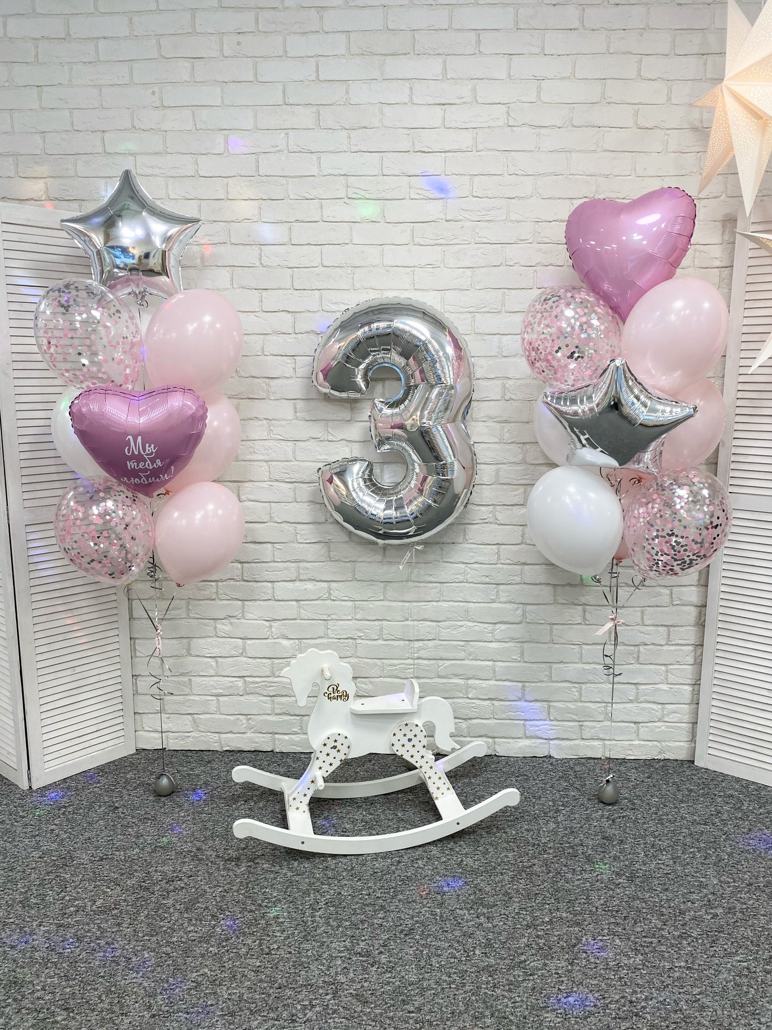 - Два Фонтана из 10 однотонных шаров: сердце, звезда, 2 с конфетти, 6 однотонных. +одна надпись индивидуальная