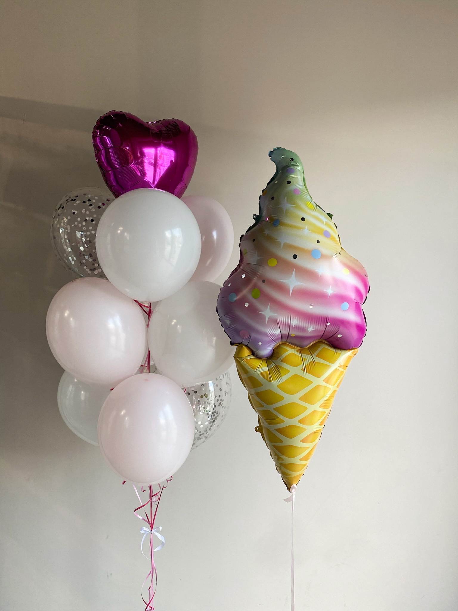 - Фонтан из 10 шаров: сердце, 2 с конфетти и 7 однотонных