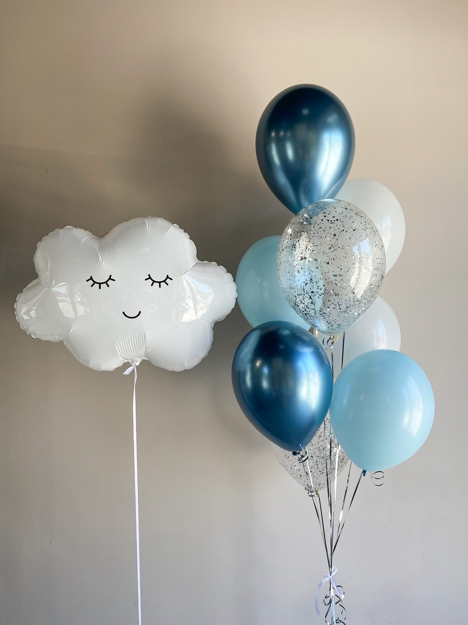 Фонтан из 8 шаров (2 хром лазурный, 2 голубой макарунс, 2 белый, 2 прозрачных с конфетти)