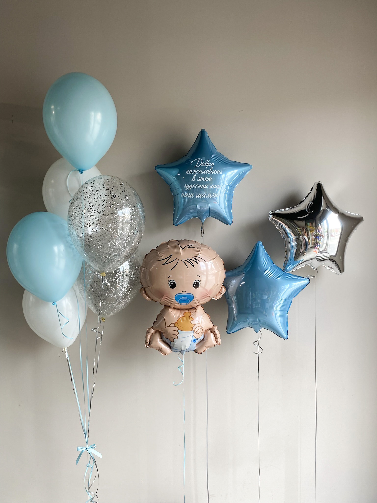 Фонтан из 6 шаров (2 голубой макарунс, 2 белых, 2 прозрачных с конфетти)