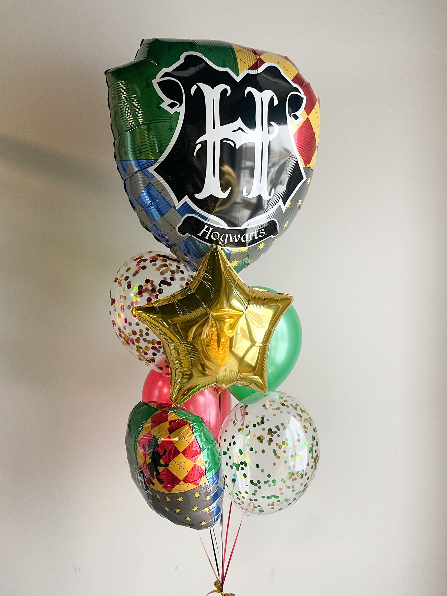 - Фонтан из 7 шаров: Фигурка Герб Хогвартса, Квадрат Гарри Поттер, звезда, 2 с конфетти, 2 однотонных.
