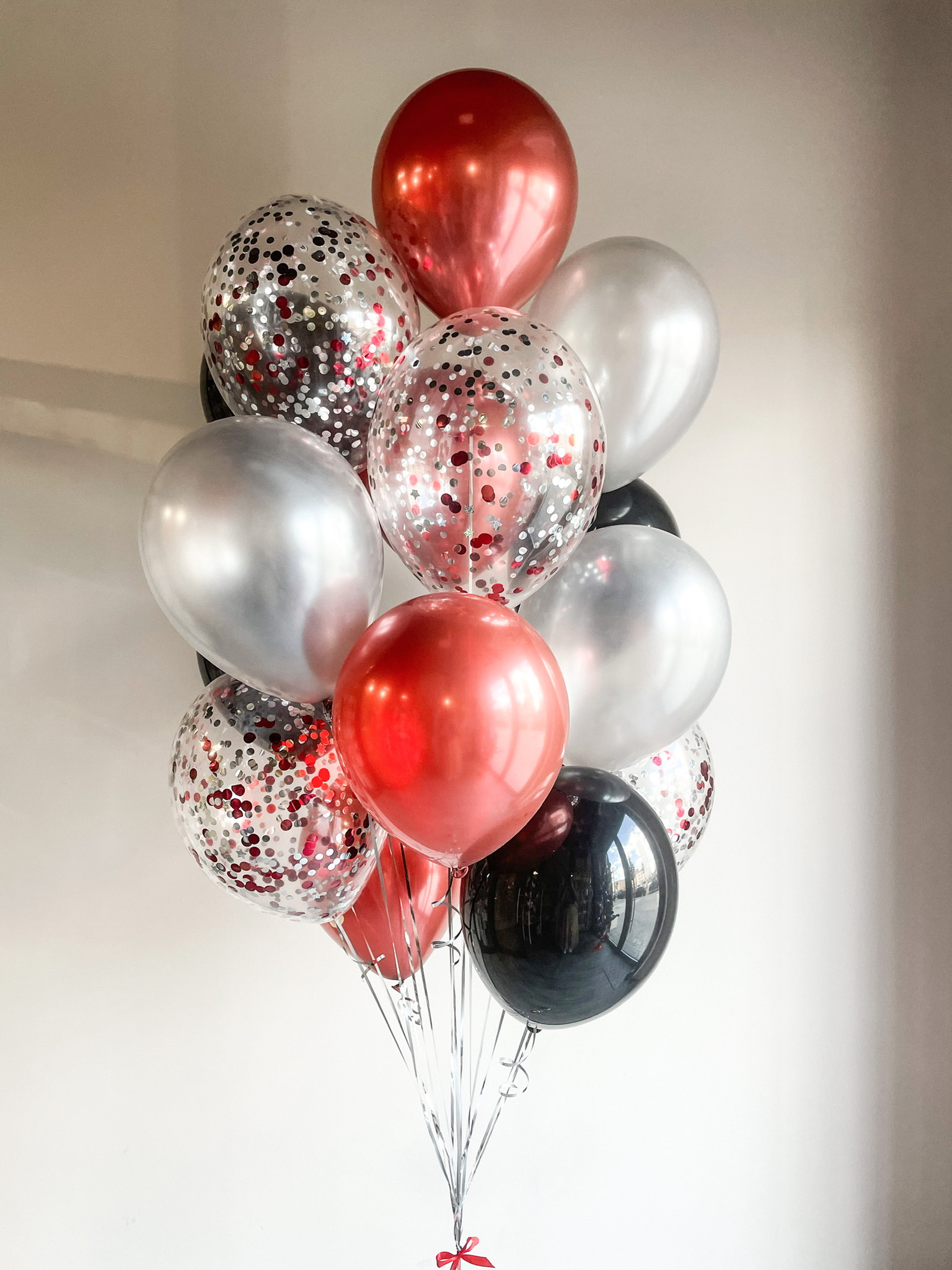 - Фонтан из 16 шаров: 4 с конфетти, 4 хром и 8 однотонных