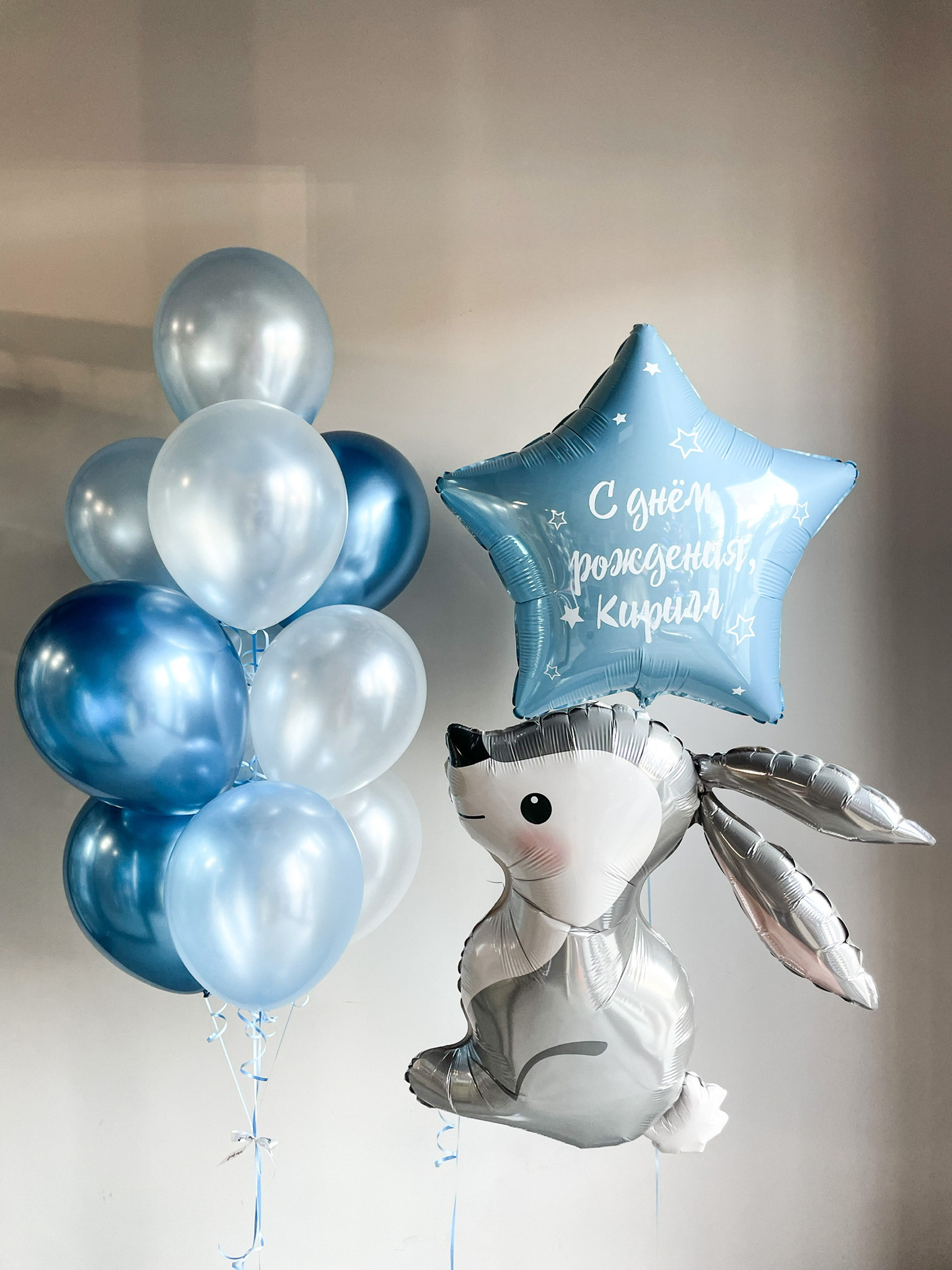 Фонтан из 10 шаров (3 хром лазурный, 4 голубой перламутр, 3 белый перламутр)