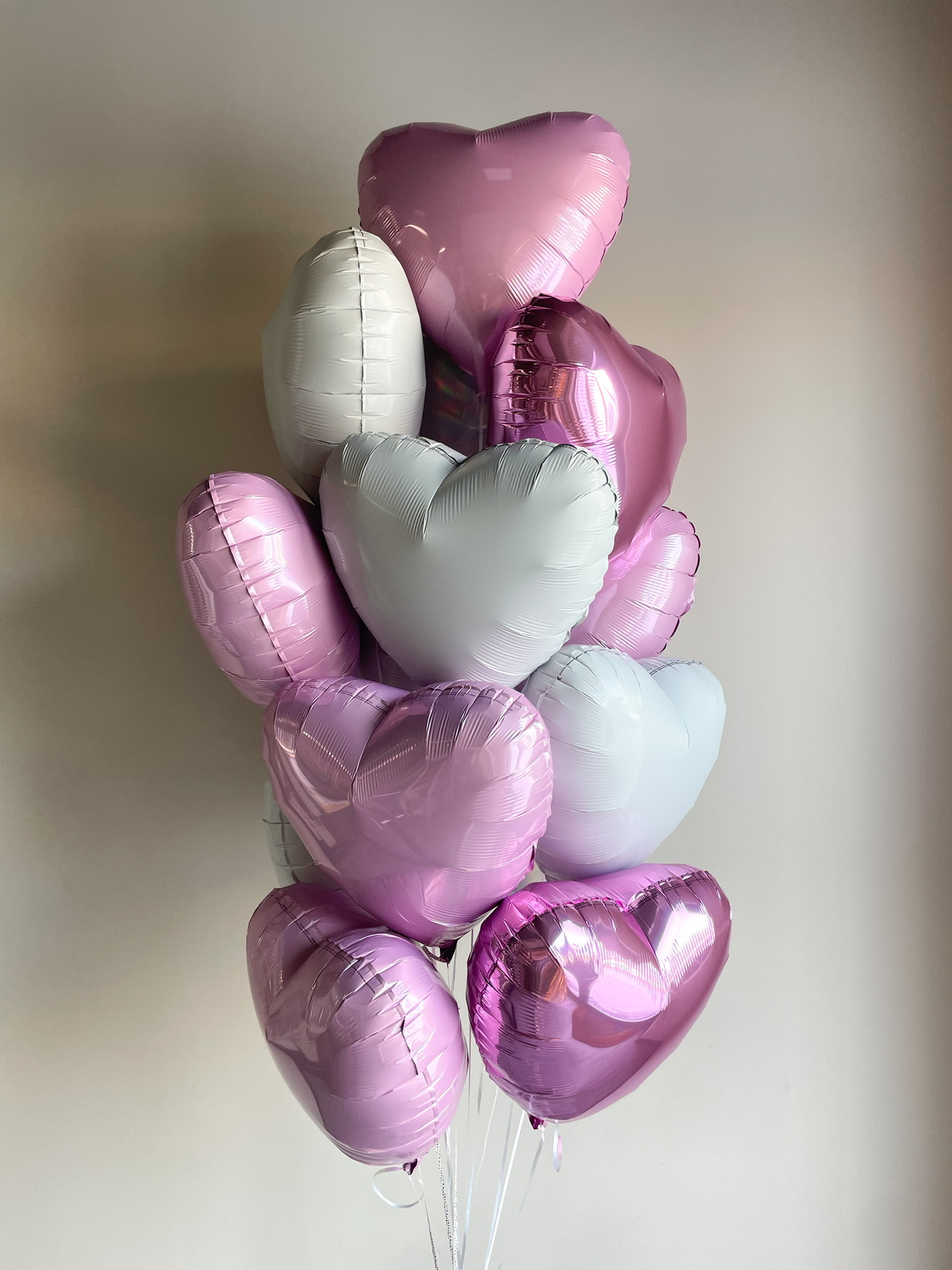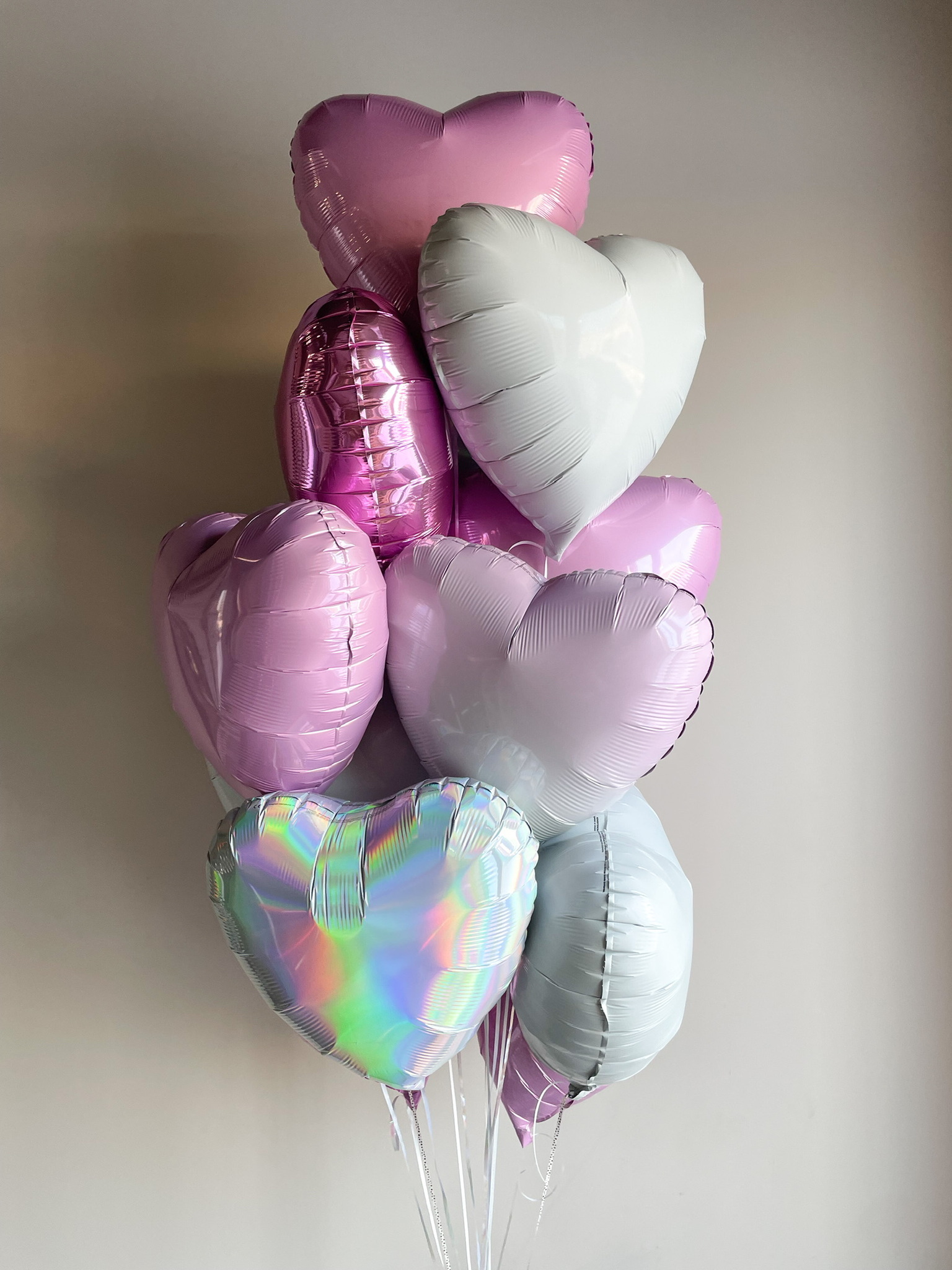 Фонтан из 15 сердец (3 сердца голография, 5 белых, 2 розовый градиент, 5 розовых)